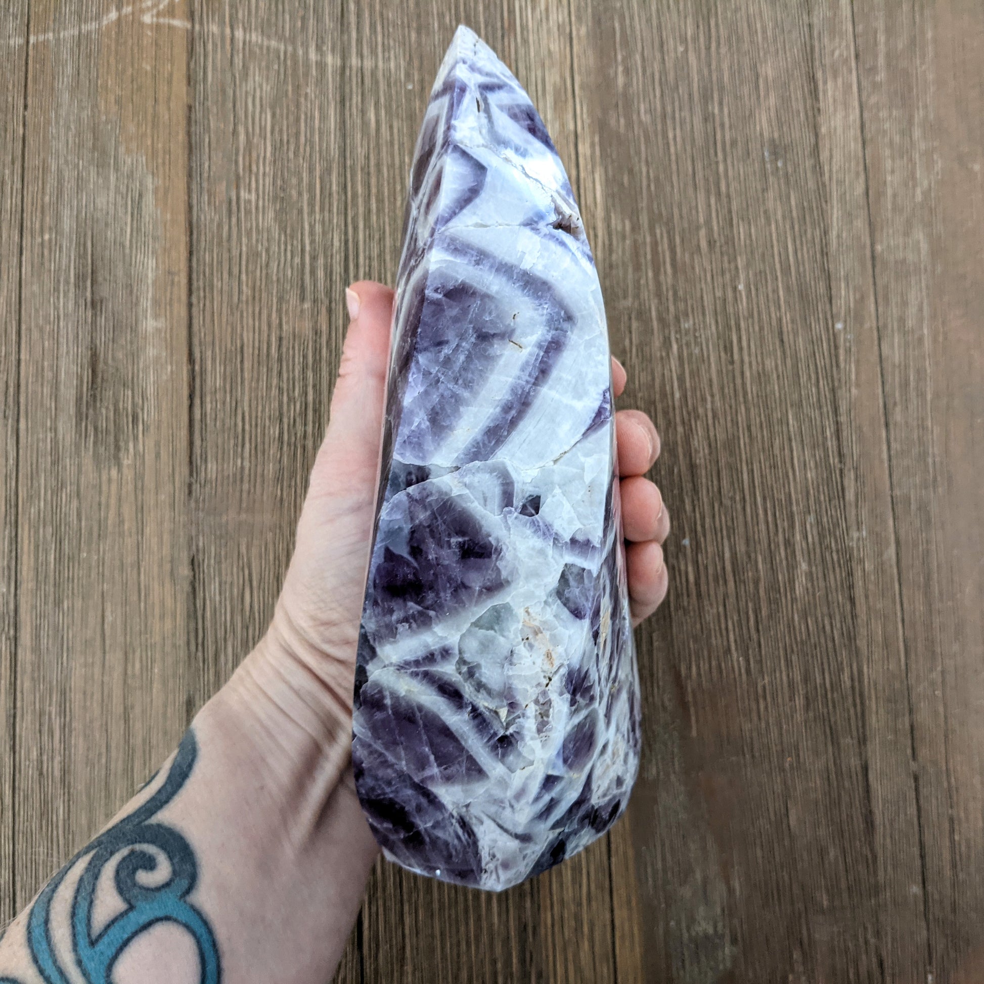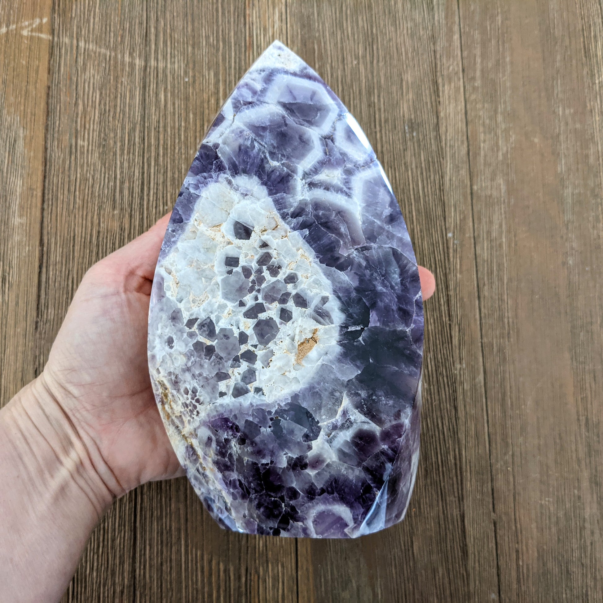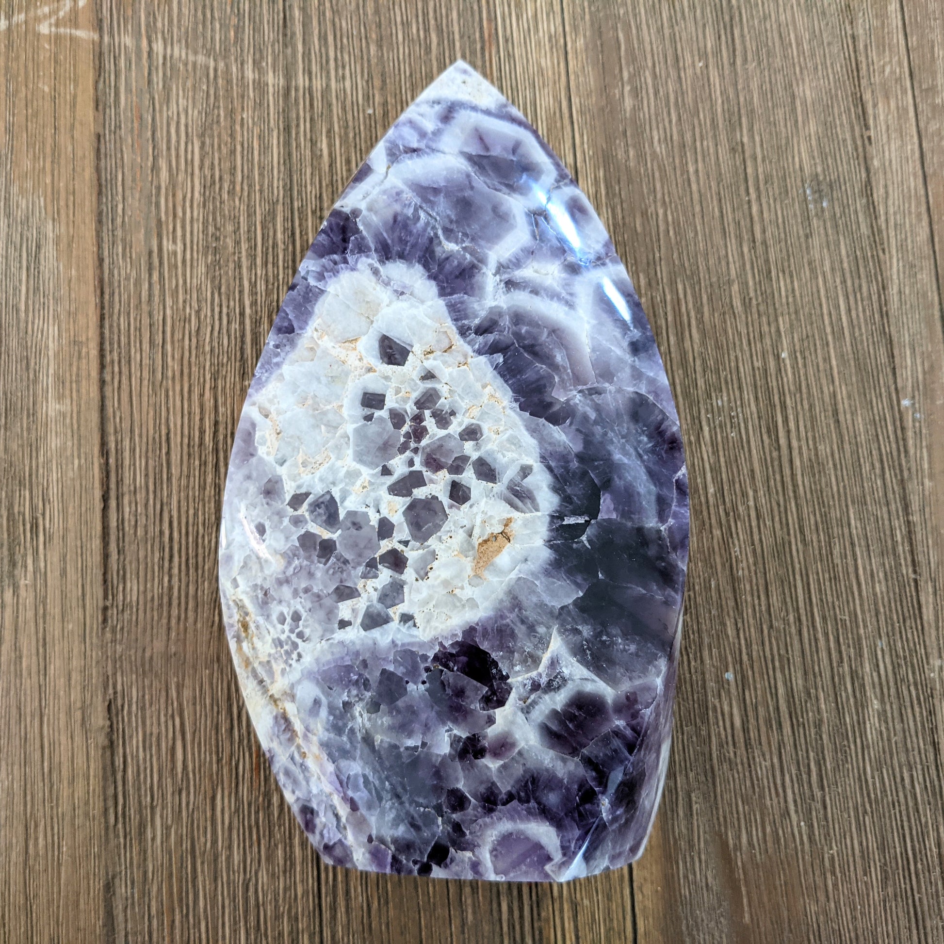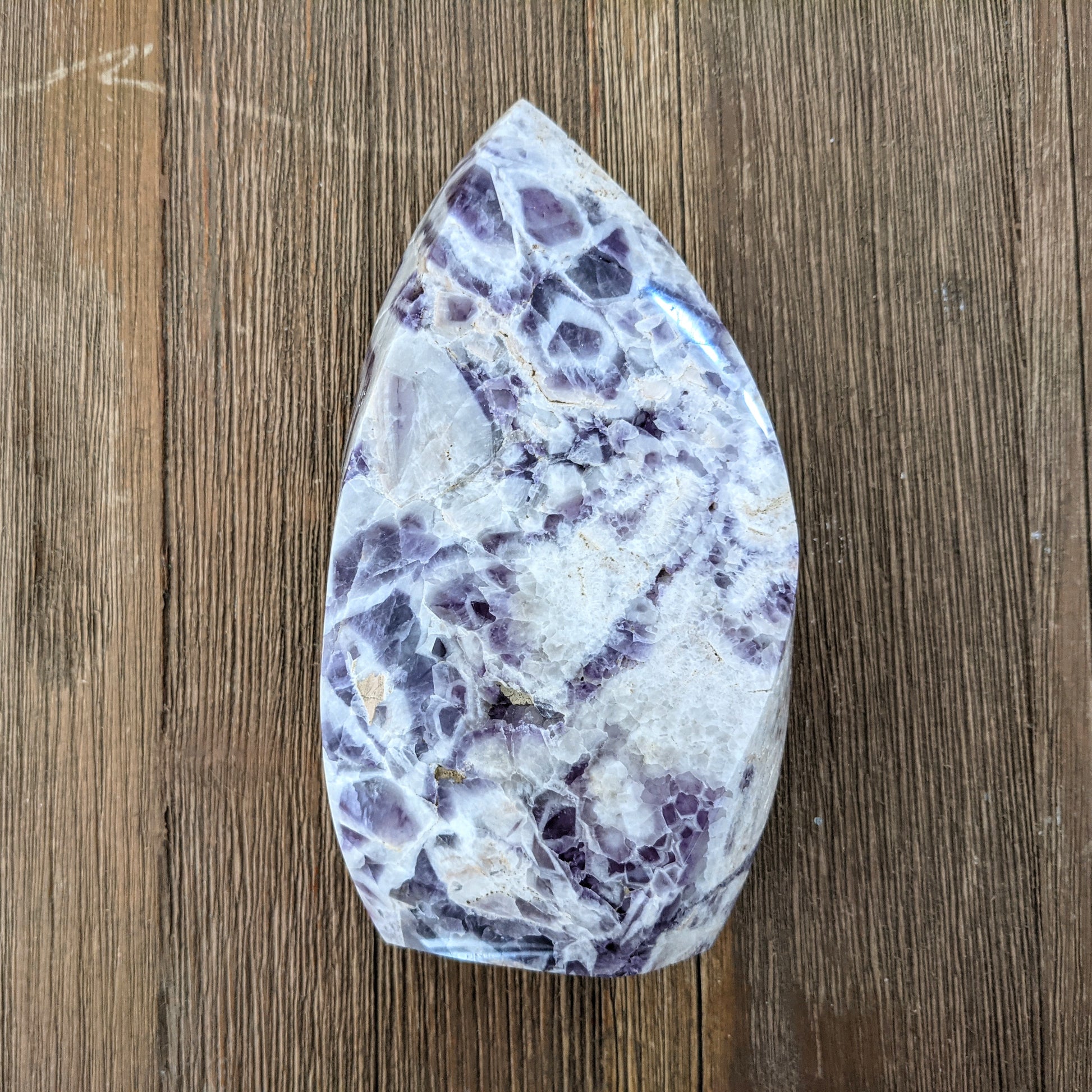 This is chevron amethyst, also called dogtooth amethyst, that has been carved into a flame shape. The white portions of this amethyst are composed of calcite, which is clearing and uplifting.