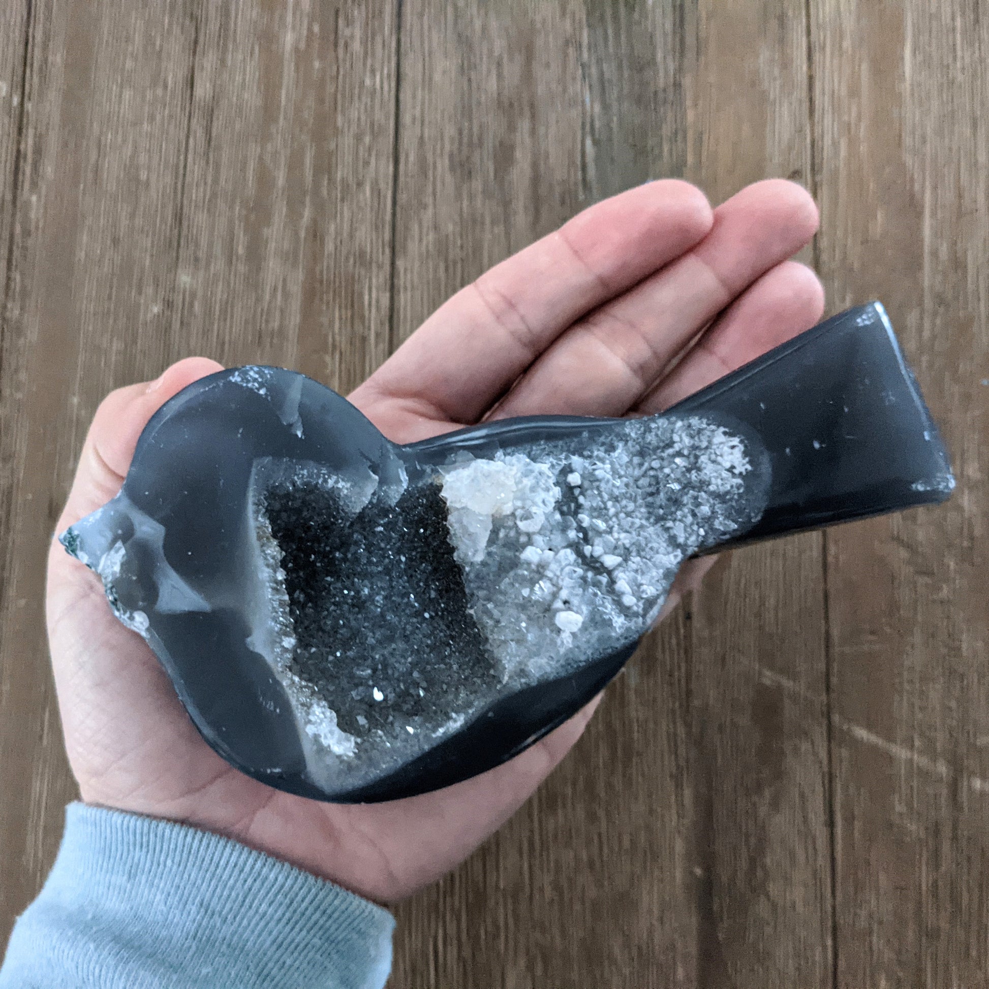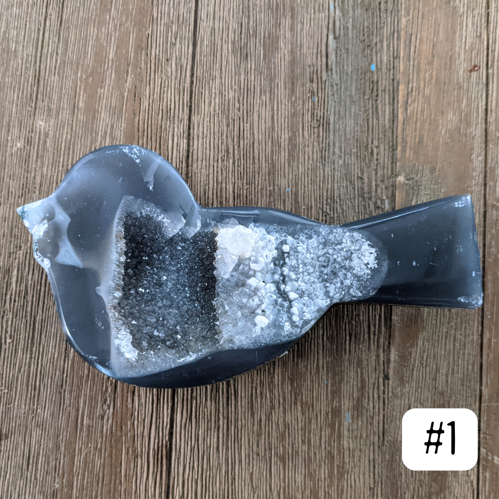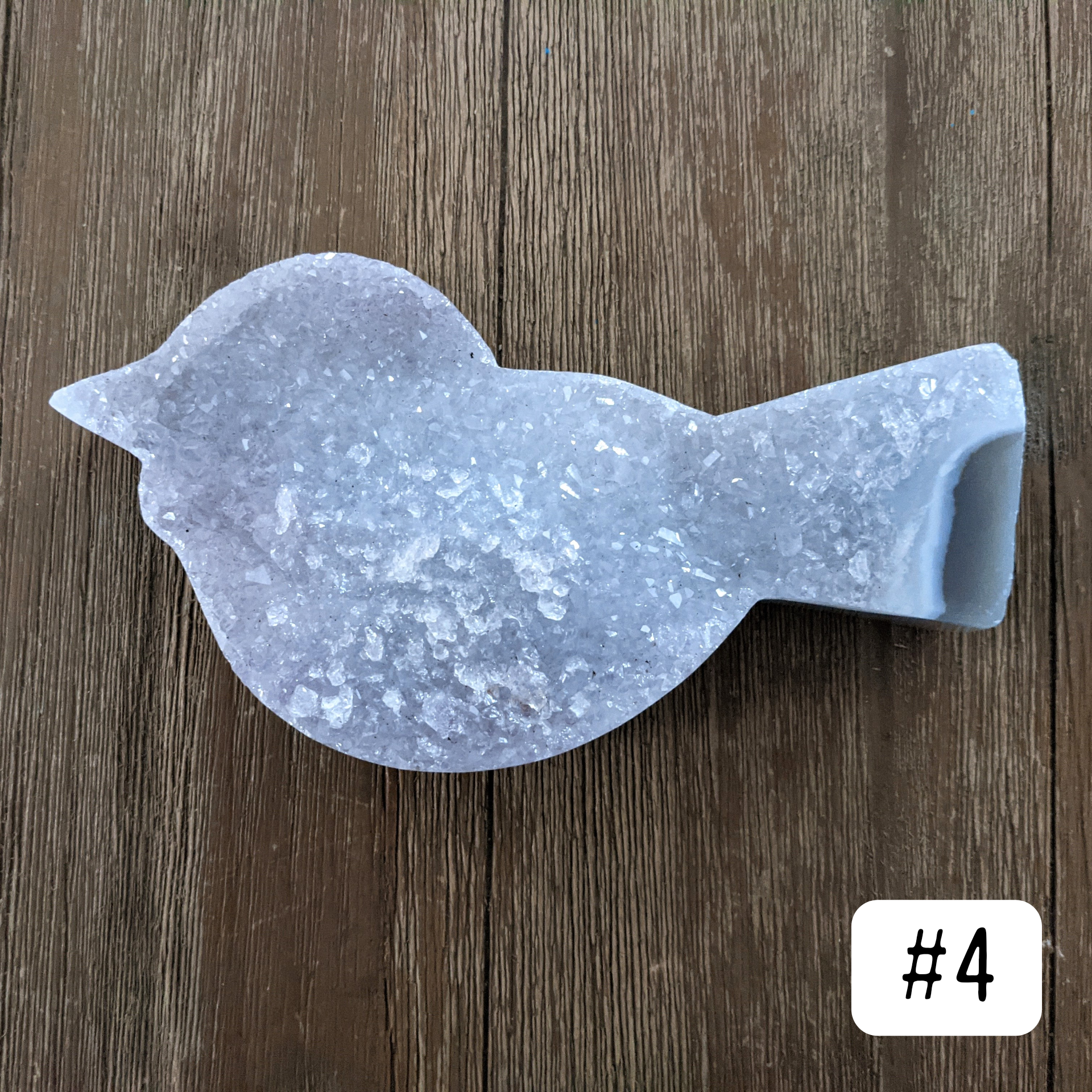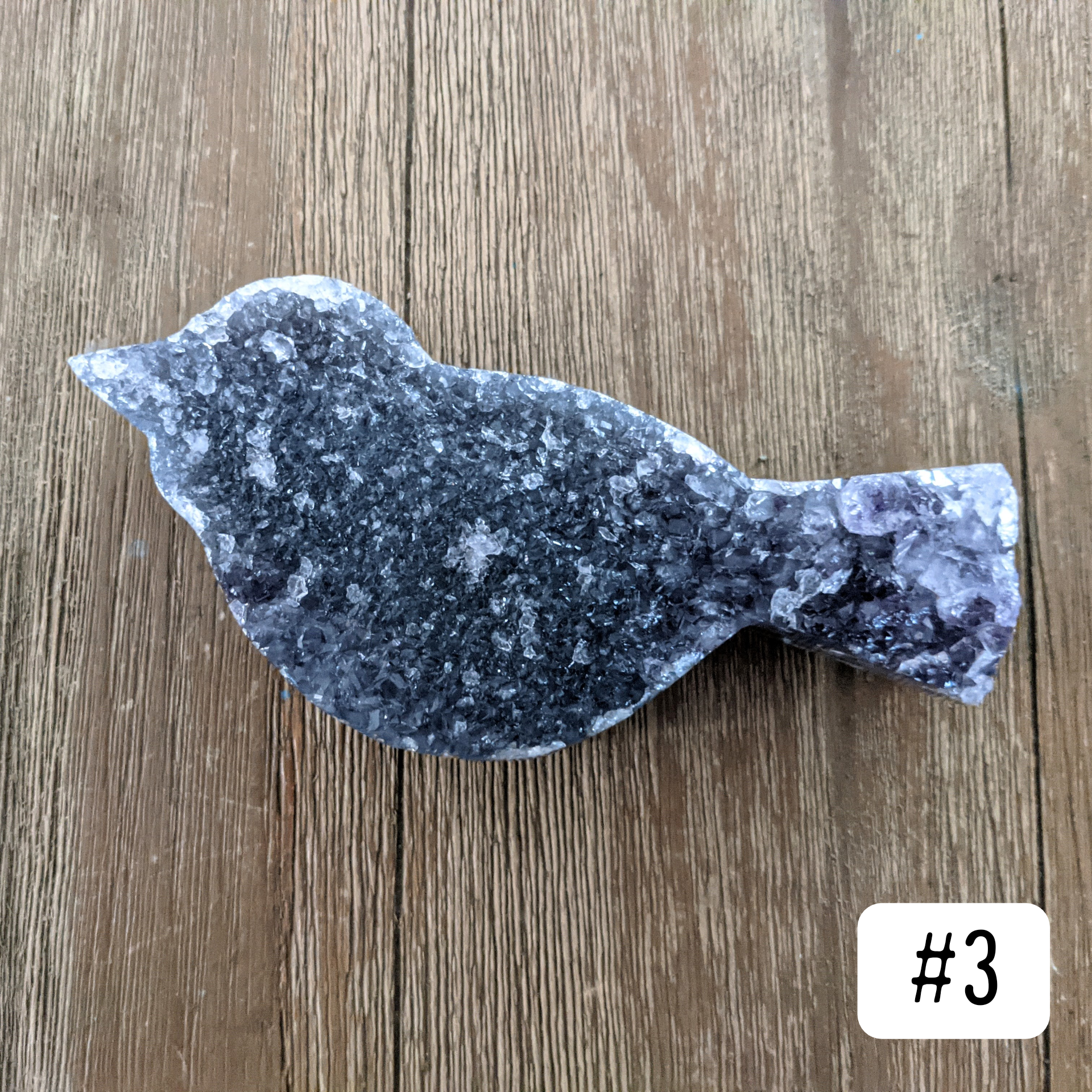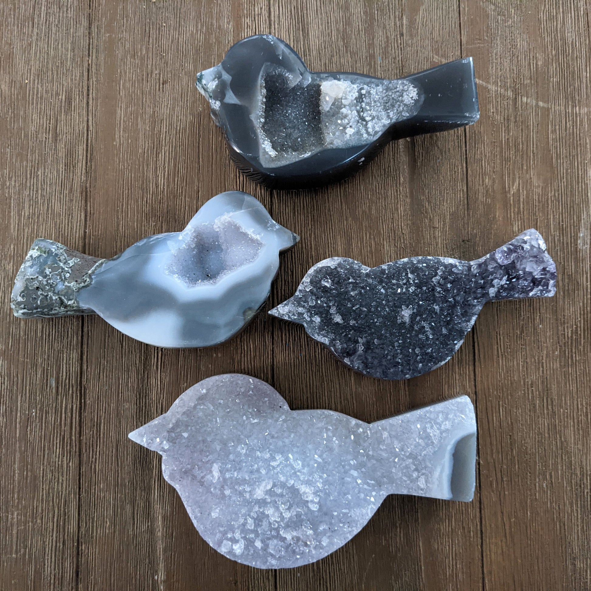 These beautiful sparrows are created from amethyst geodes. The geodes are all unique from each other and have interesting coloration and textures. All are sparkly and breathtaking! (Sold by weight.)