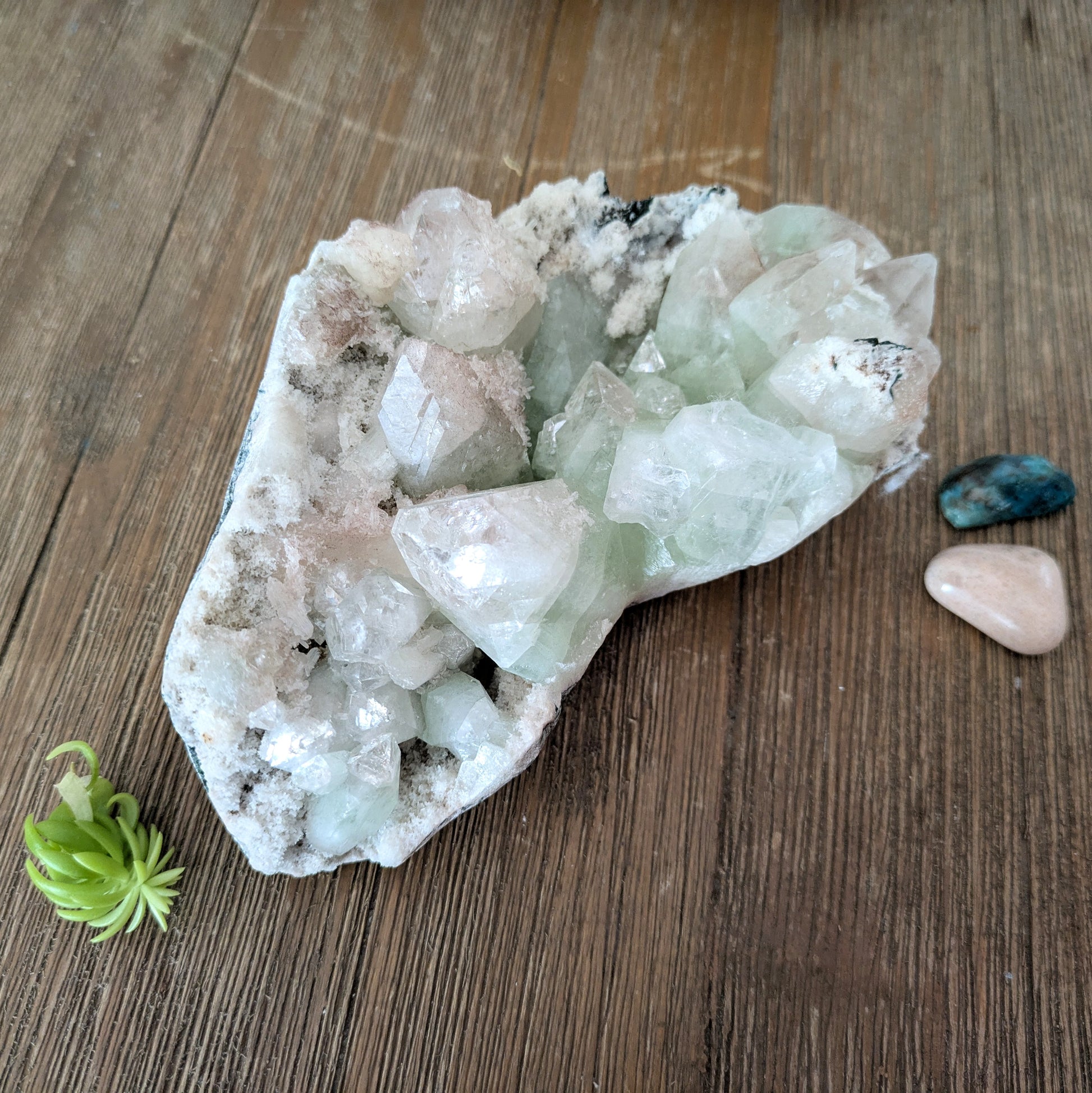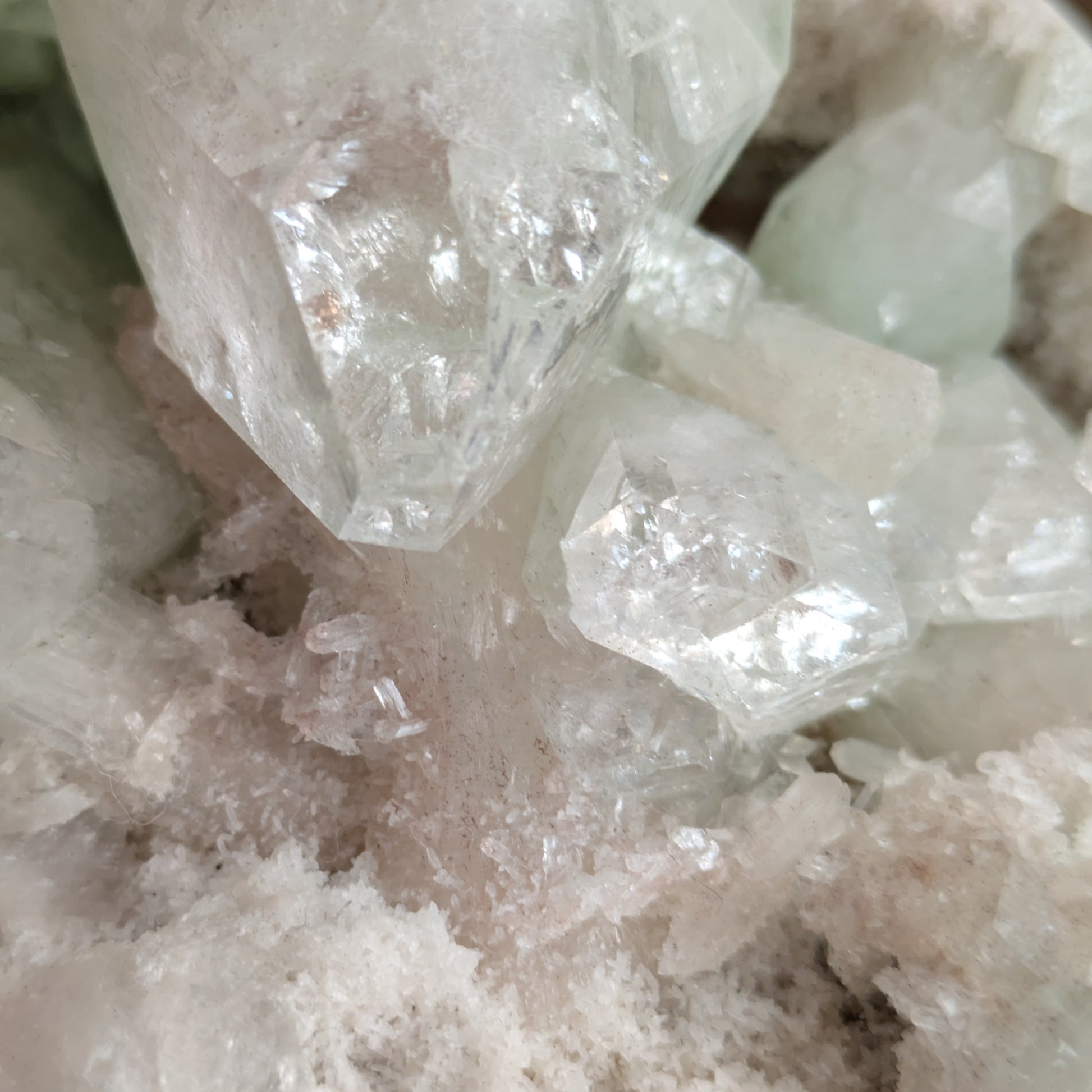 This one's got it all! Areas of both clear and pale green apophyllite as well as some pink heulandite. When I hold this crystal, I immediately feel clarity as well as uplifting joy.