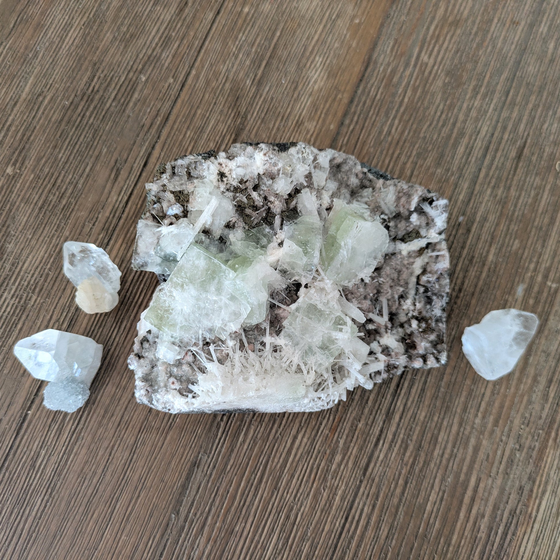 Now this one's got some attitude. This crystal comes from the Himalayas region of India. It's here to make a statement. Green apophyllite crystals sit amongst incredibly interesting zeolite formations. The energy of this feels like it's ready to get some spiritual work done - no more playing around, it's time to get down to business.