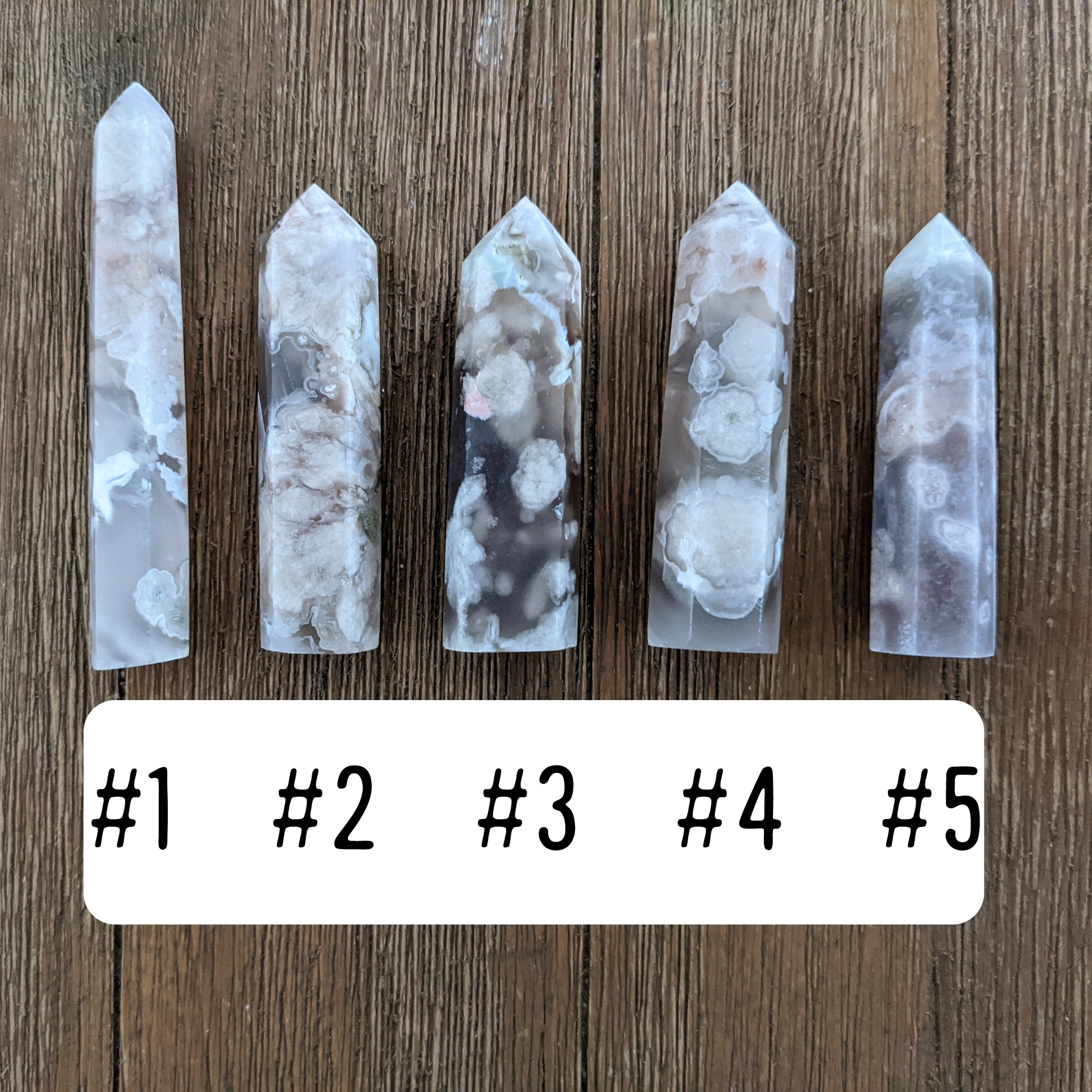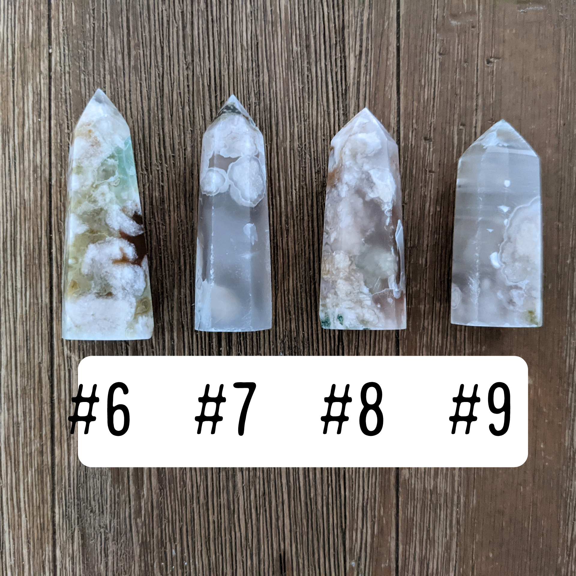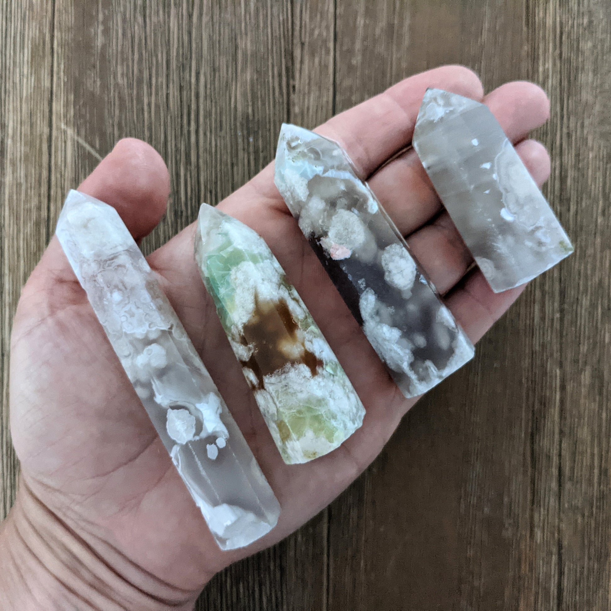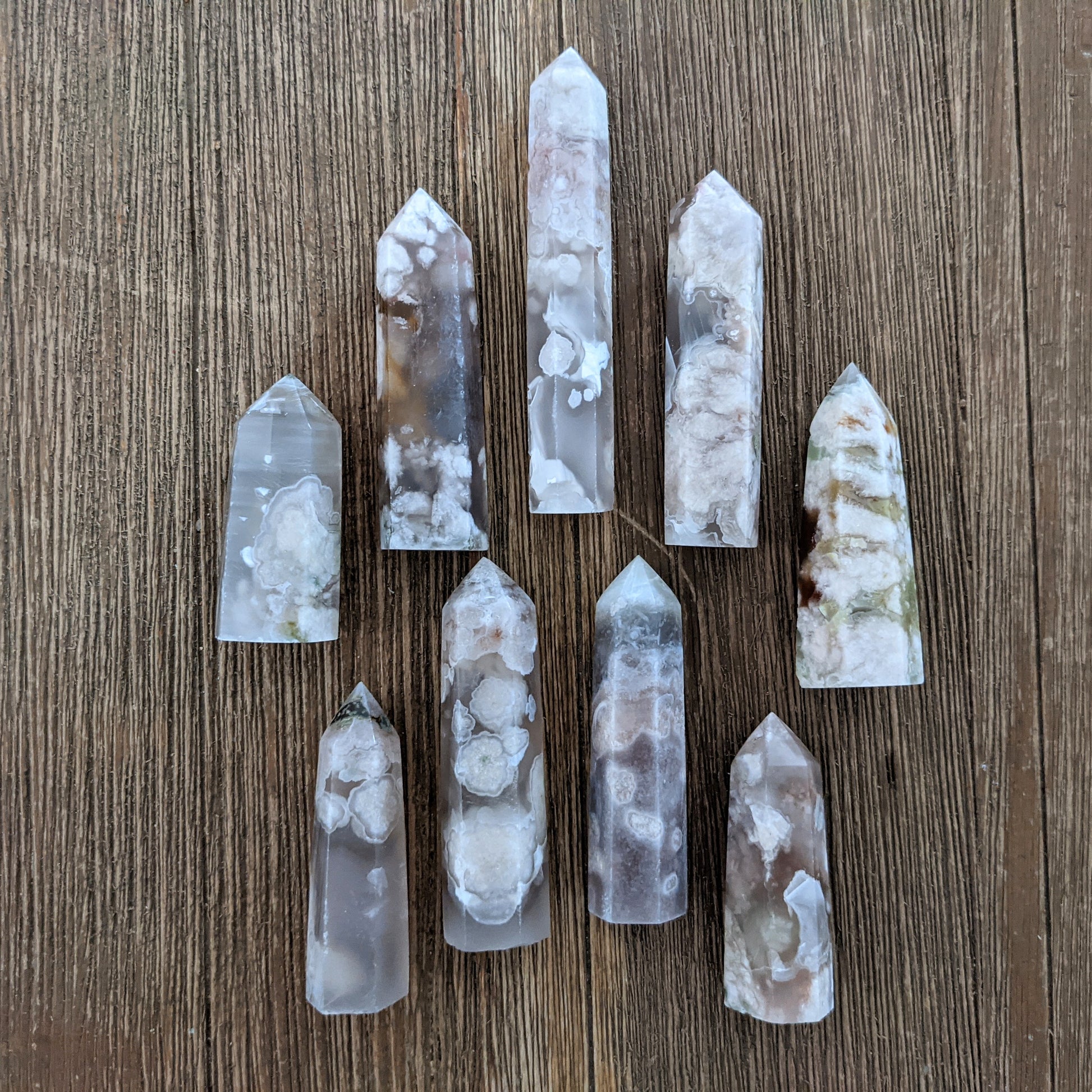 Flower agate is a current staple for me! The combination of stability and inner joy can't be beat. These beautiful towers have amazing variation in color and internal texture.