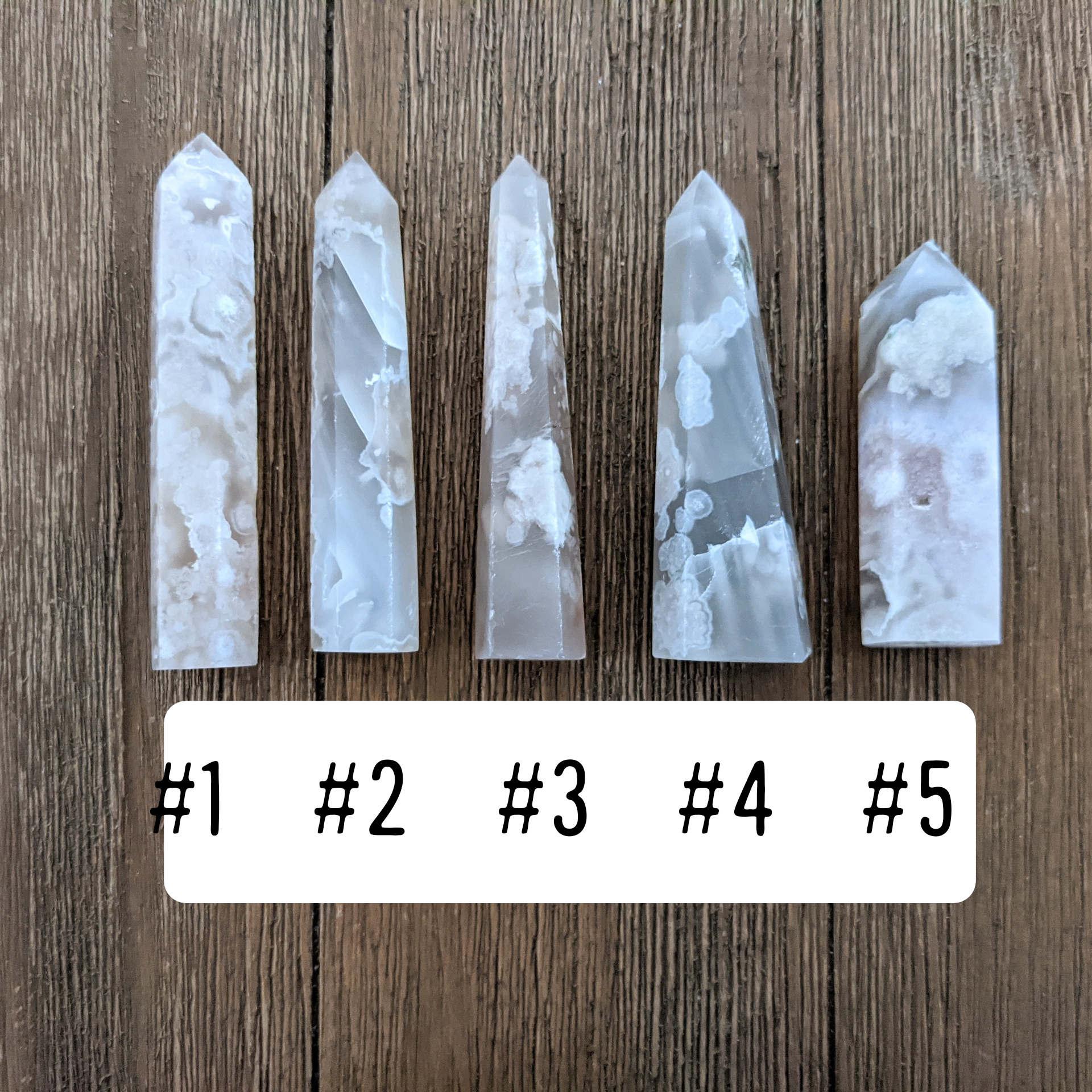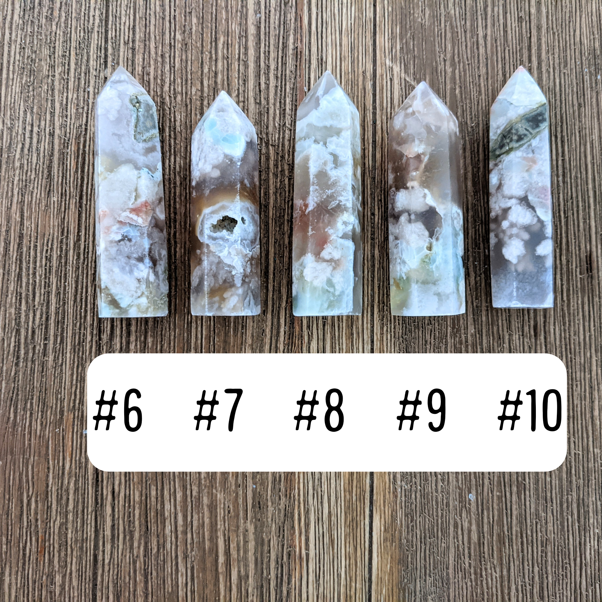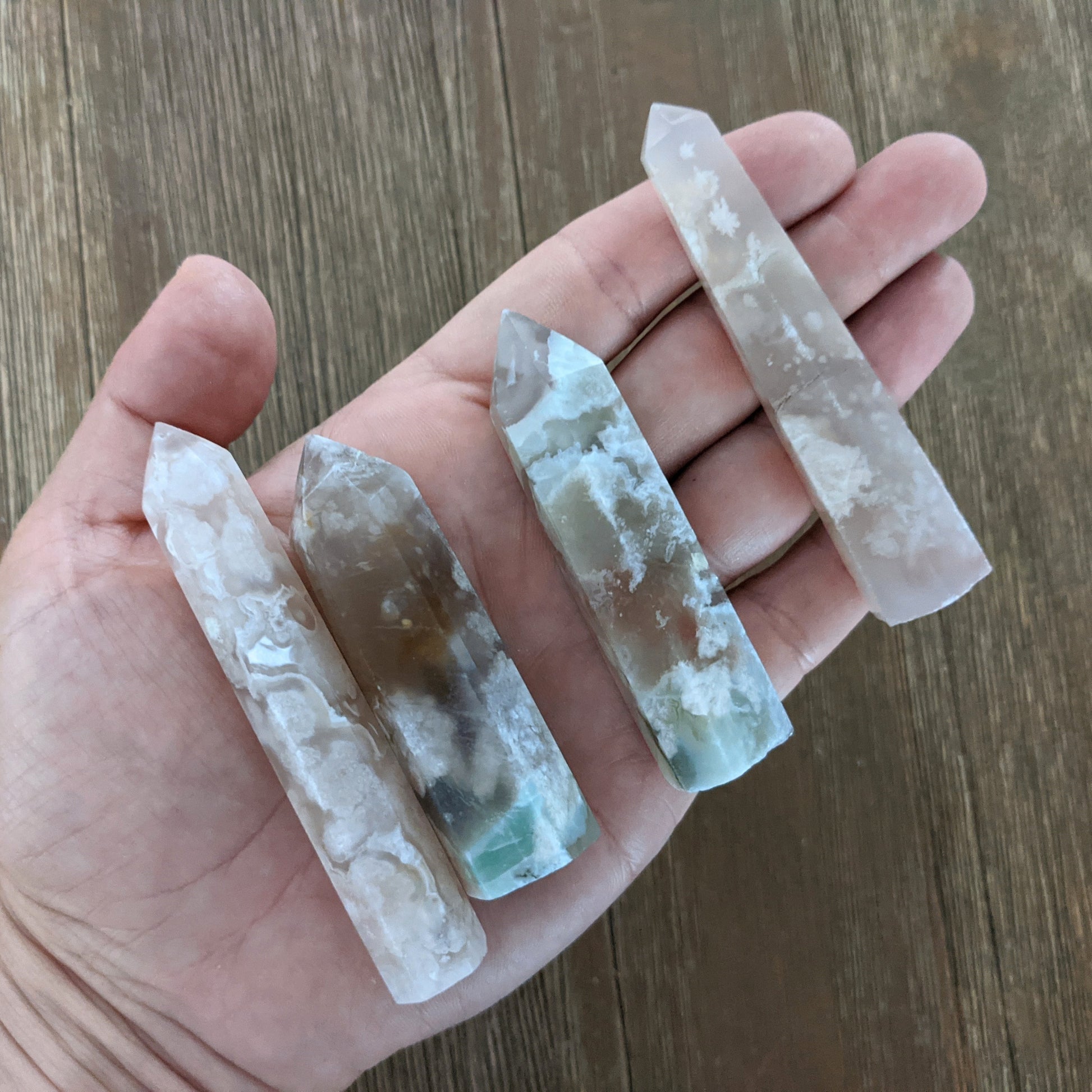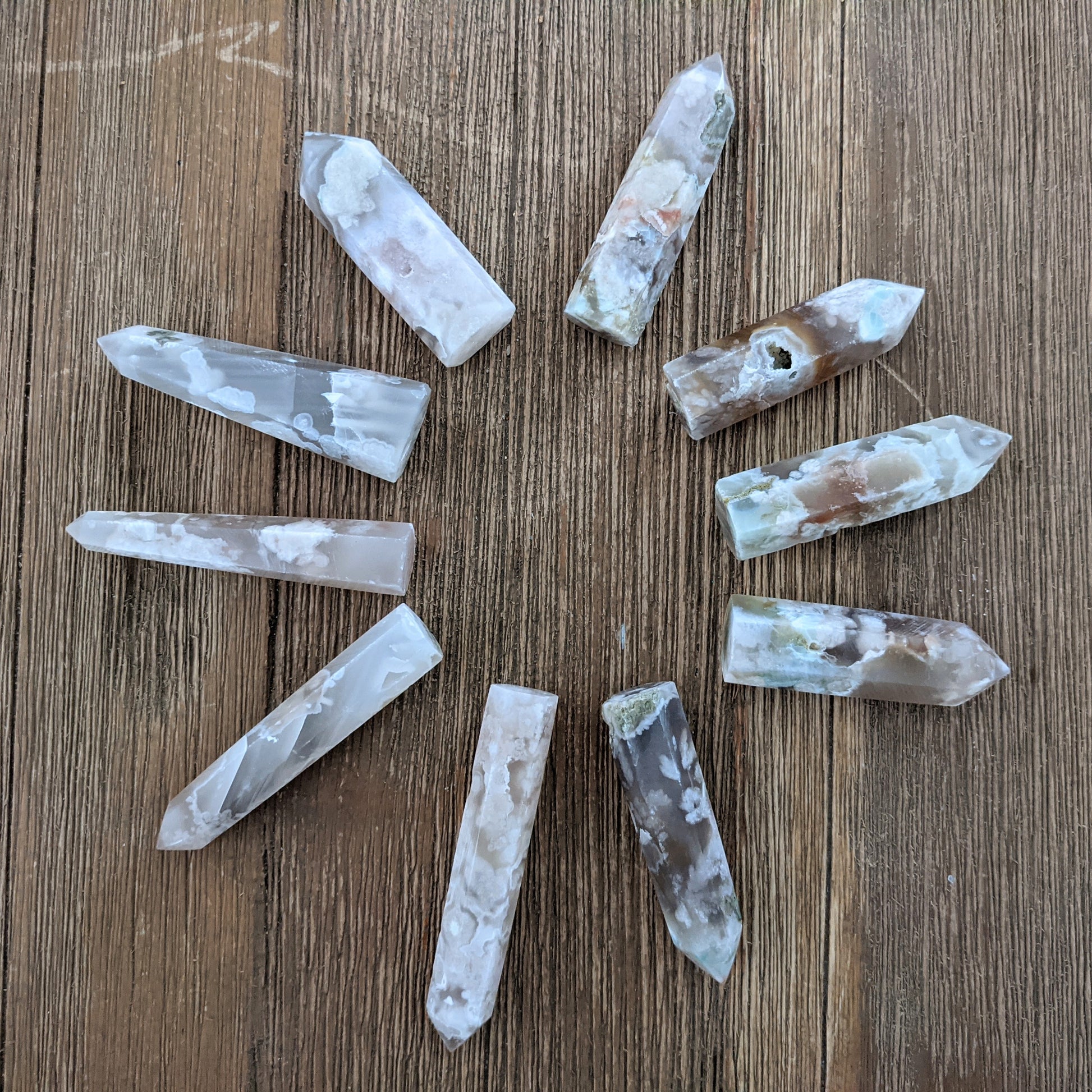 Flower agate is a current staple for me! The combination of stability and inner joy can't be beat. These beautiful towers have amazing variation in color and internal texture.