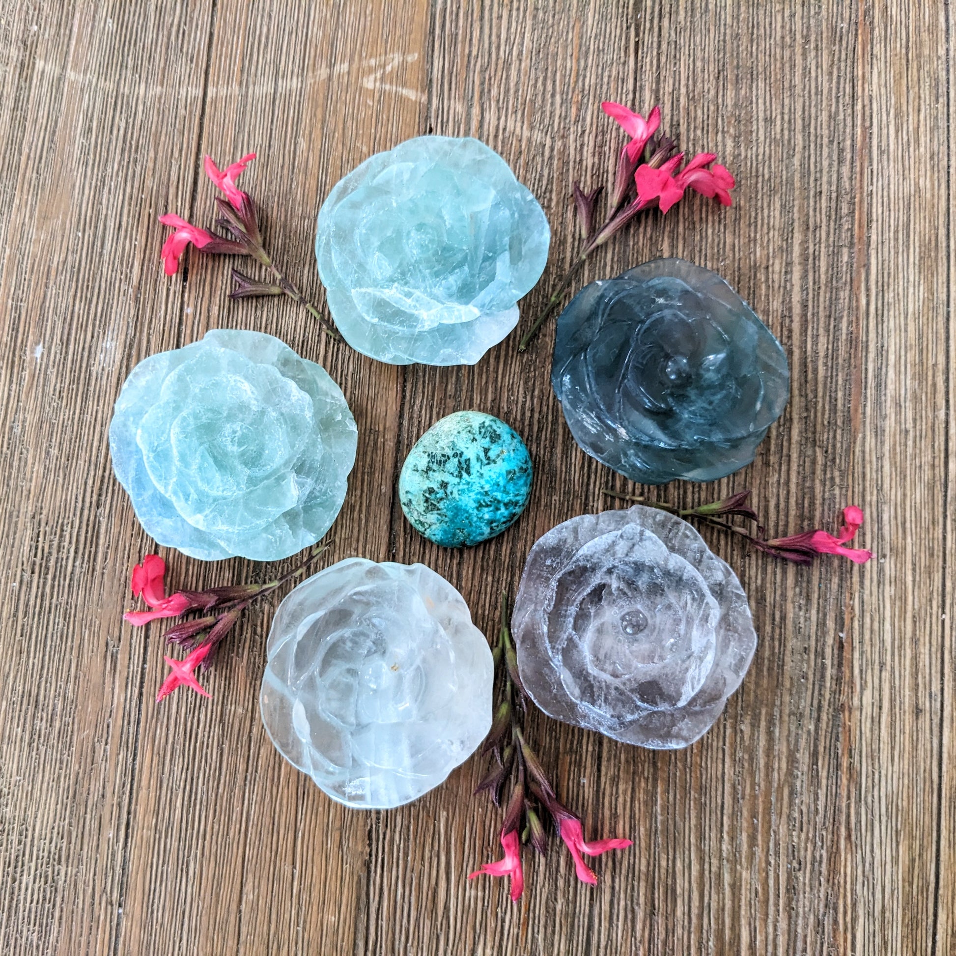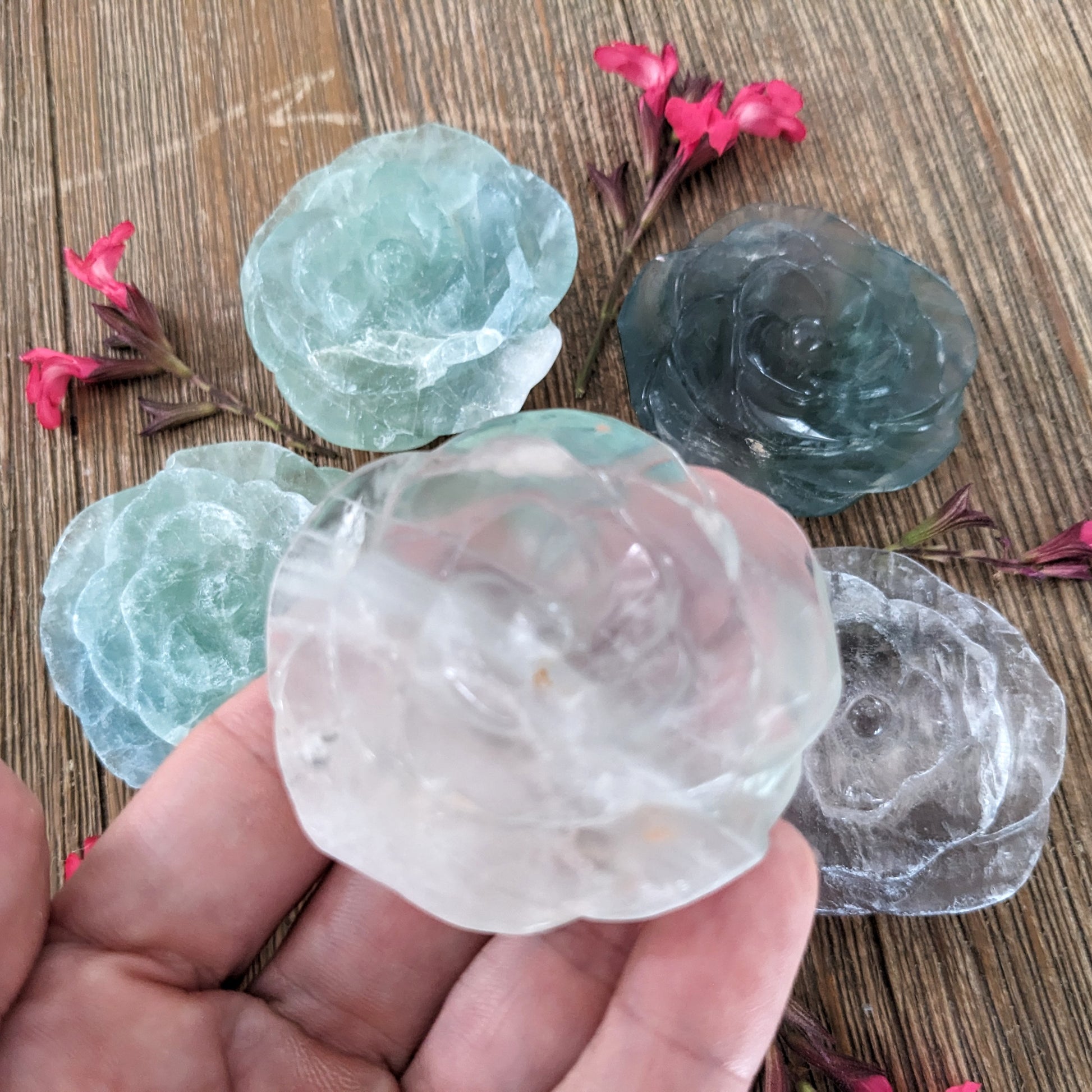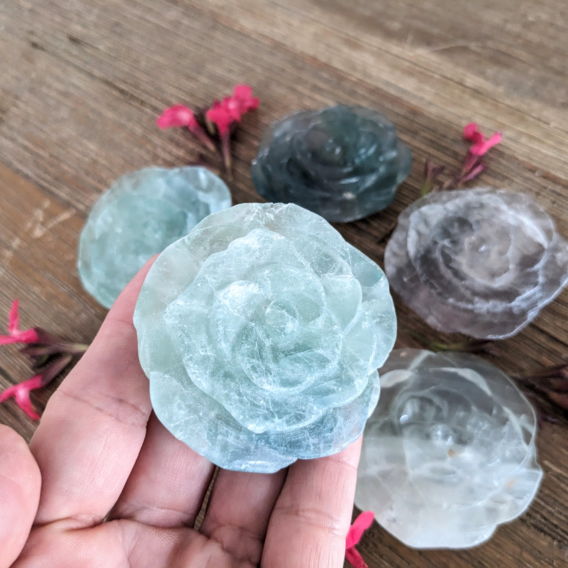 Clearing and energizing fluorite has been carved into beautiful roses!