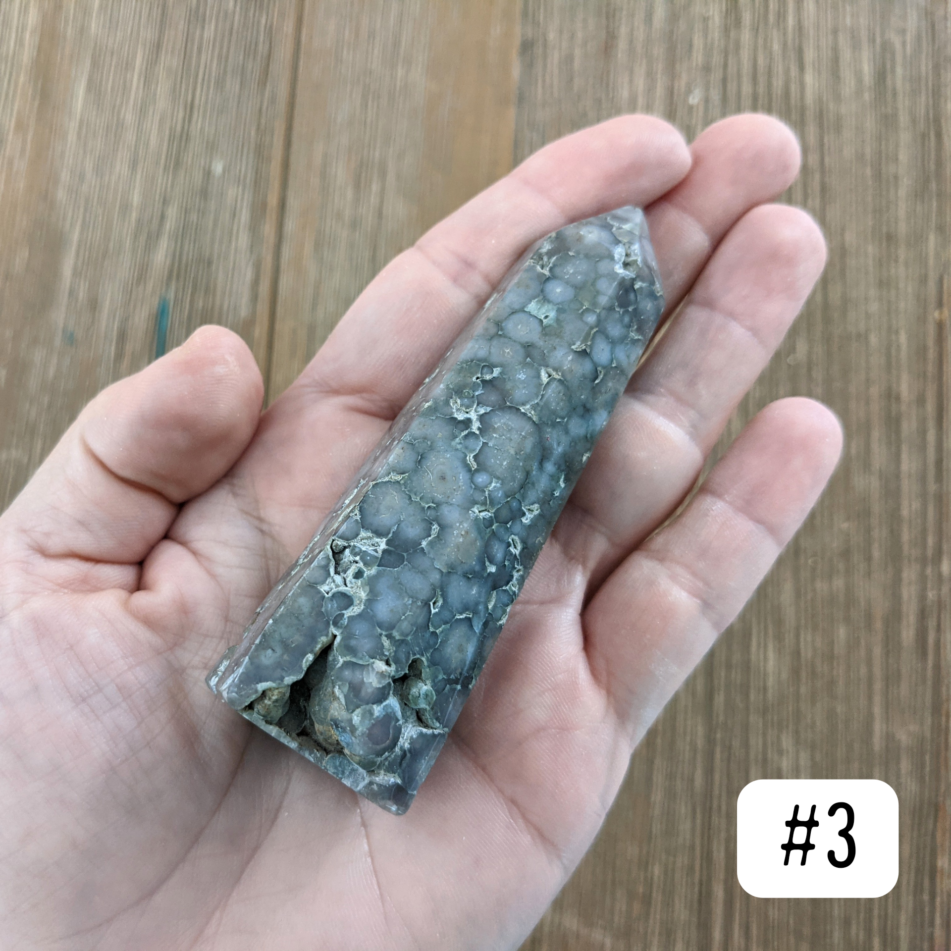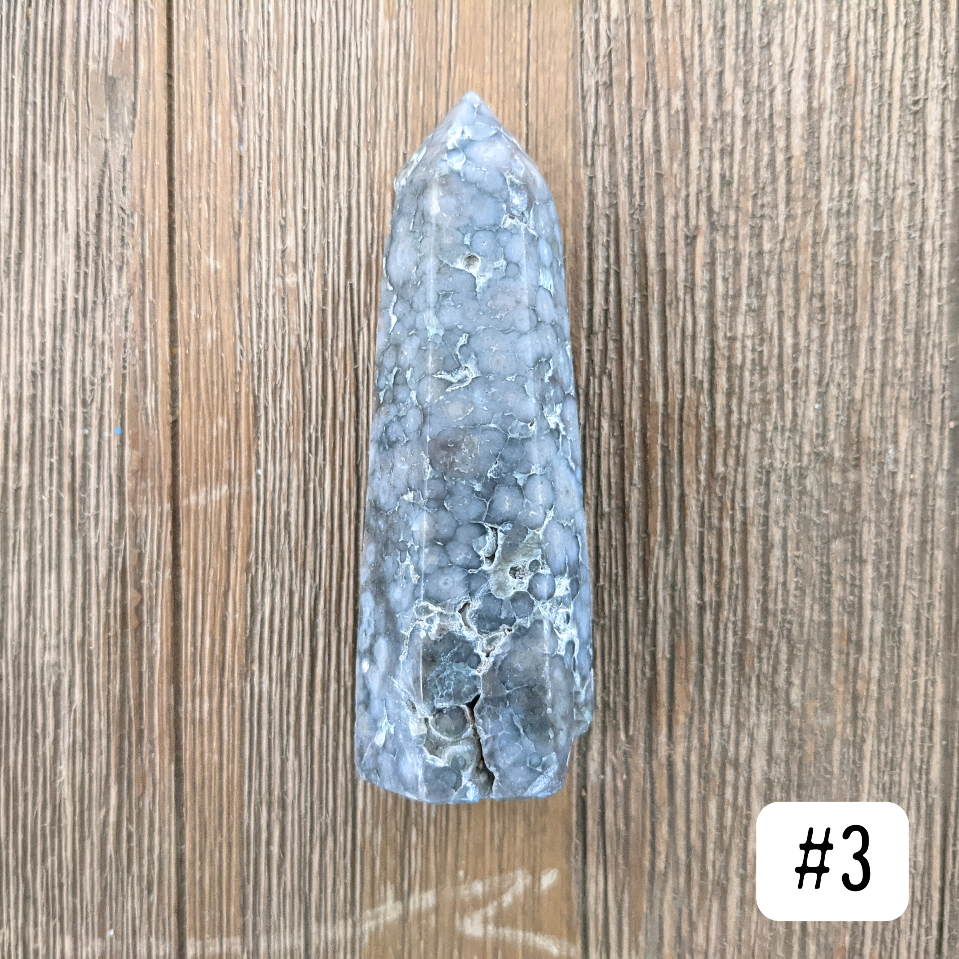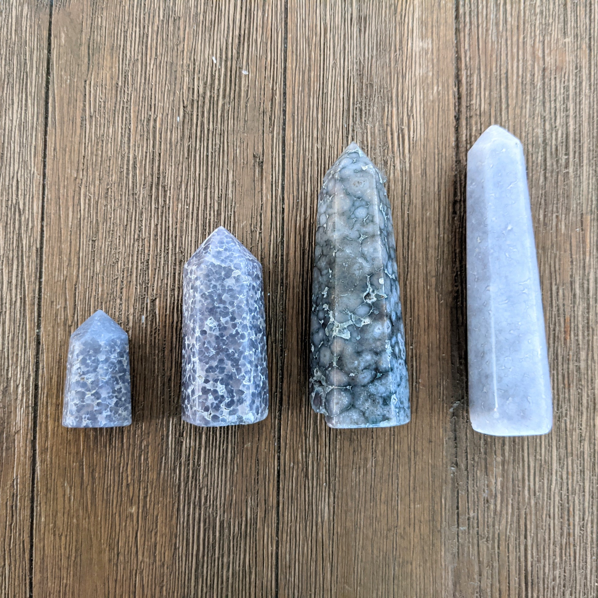 Grape agate forms as tiny spheres of purple crystals. How amazing! In these towers, they have been shaped to a point with mostly smooth sides. (Option #3 maintains some rough elements.) This is a very calming and happy stone!