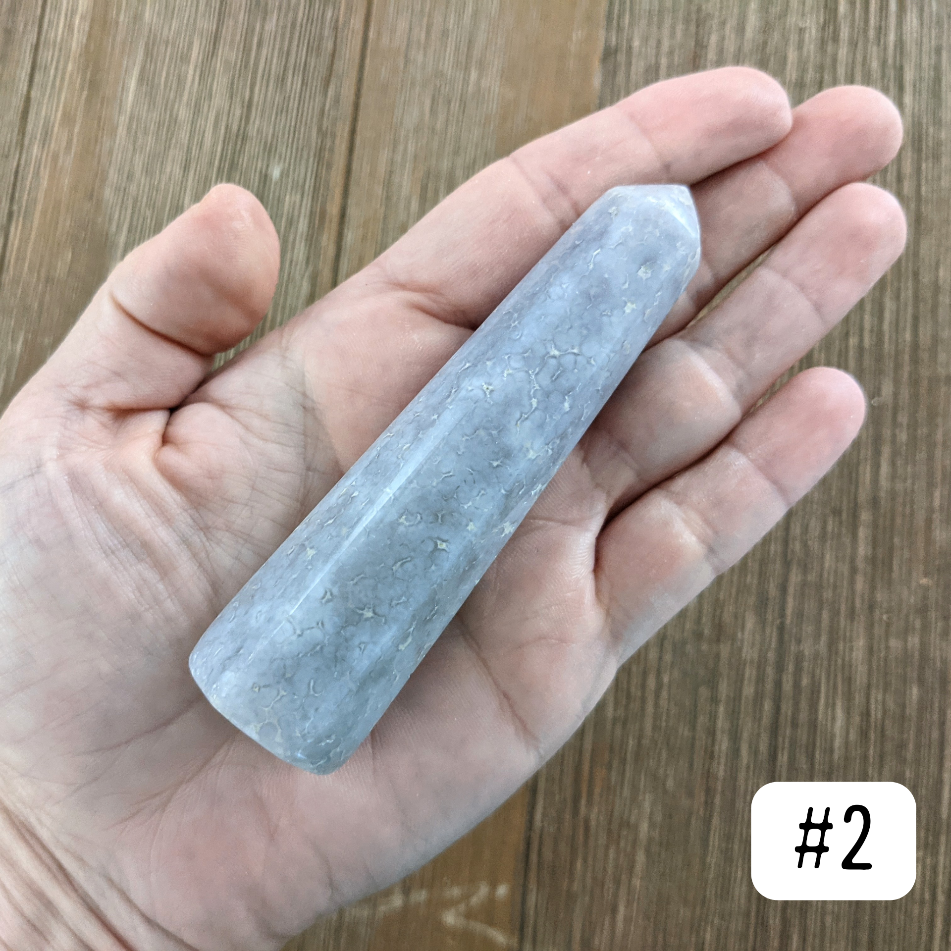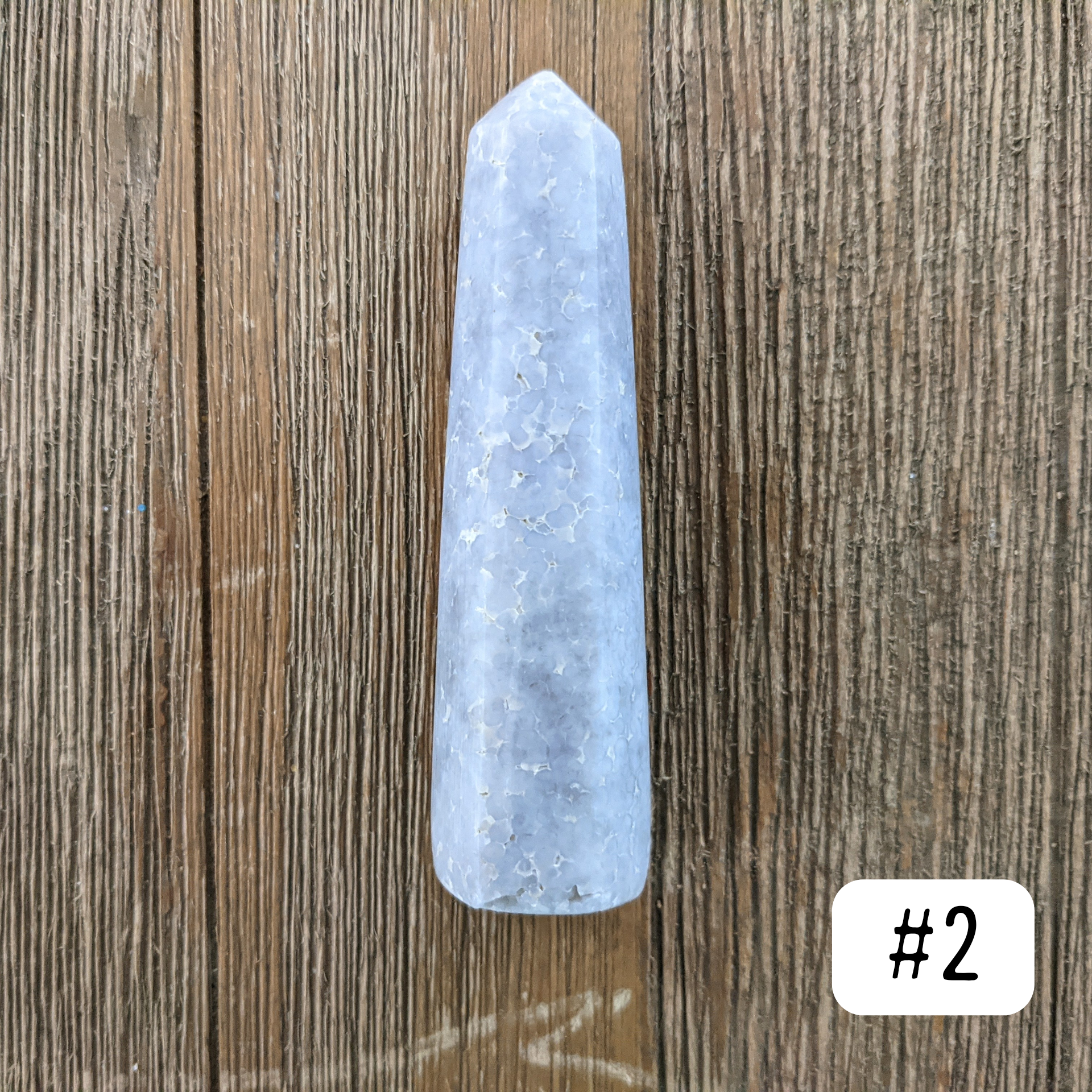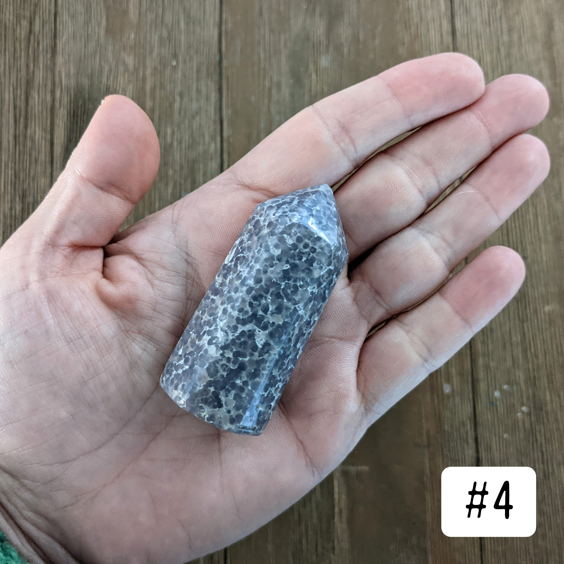 Grape agate forms as tiny spheres of purple crystals. How amazing! In these towers, they have been shaped to a point with mostly smooth sides. (Option #3 maintains some rough elements.) This is a very calming and happy stone!