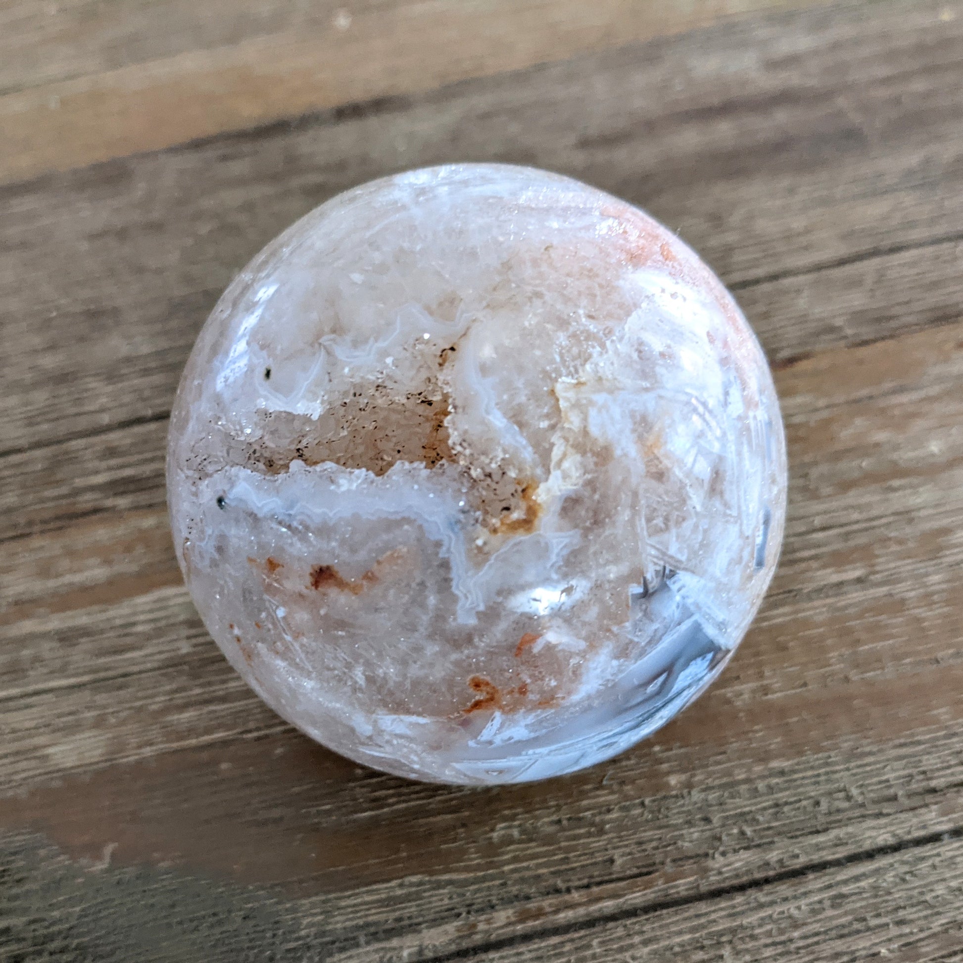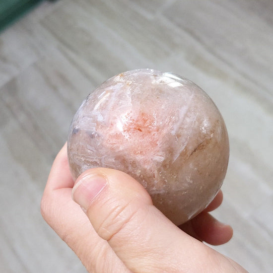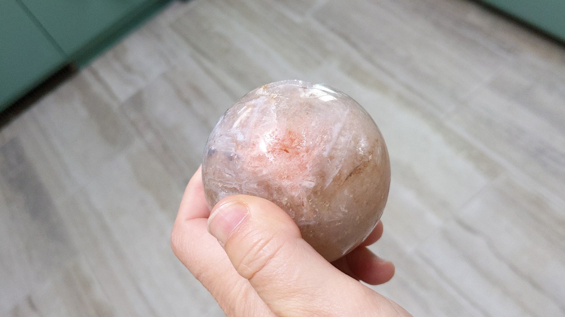 This gentle pink amethyst sphere has a variety of colors and internal textures! There is a small geode on the top and the sphere is surrounded in light pink, grey, white, clear, and bright pink hues. Breathtaking!