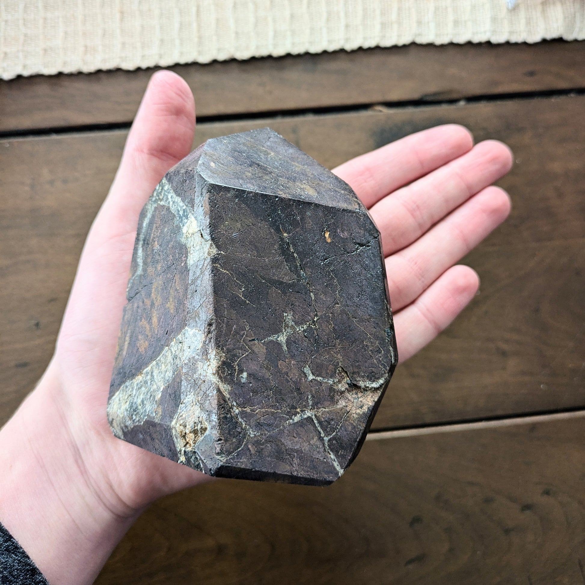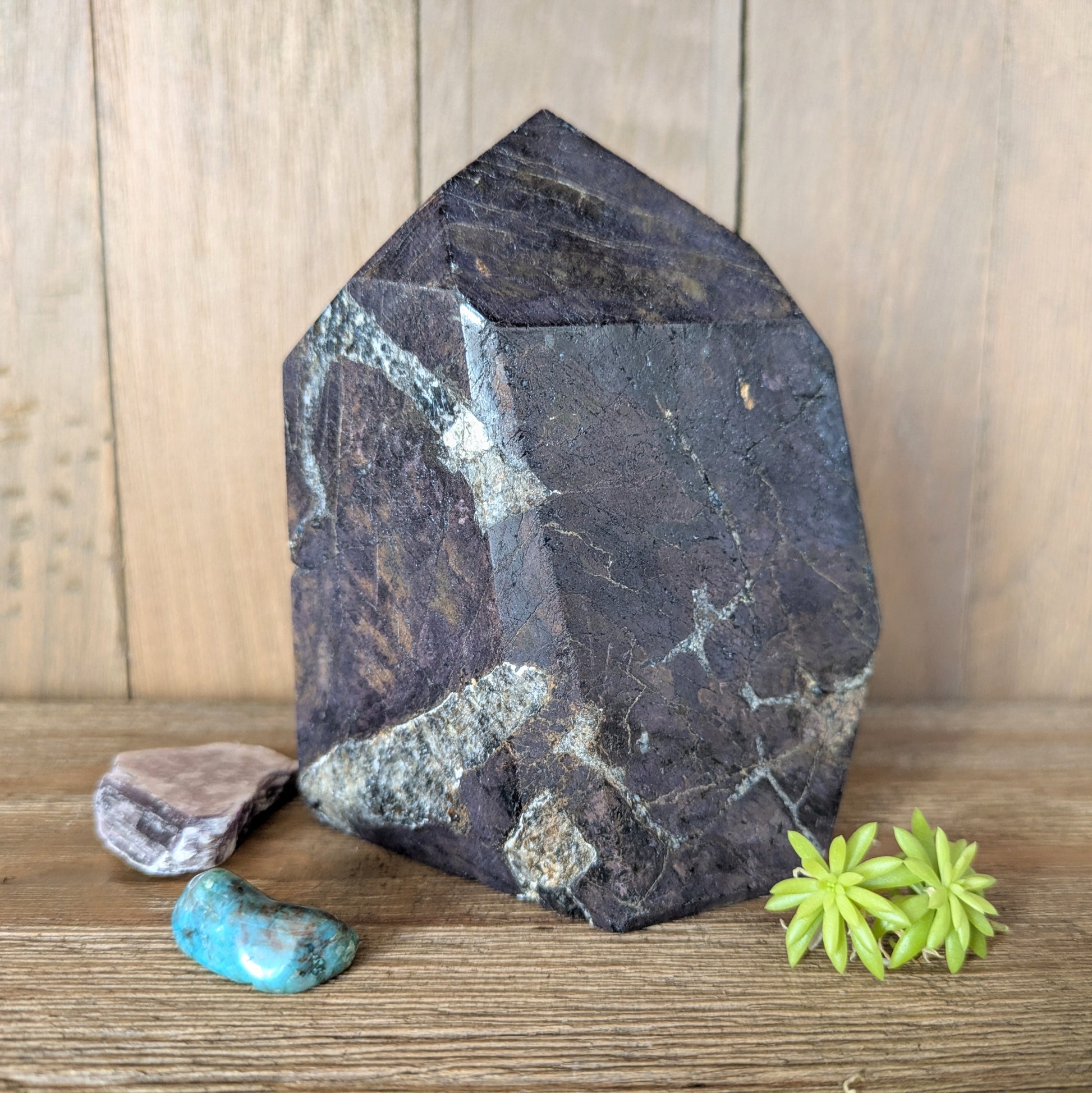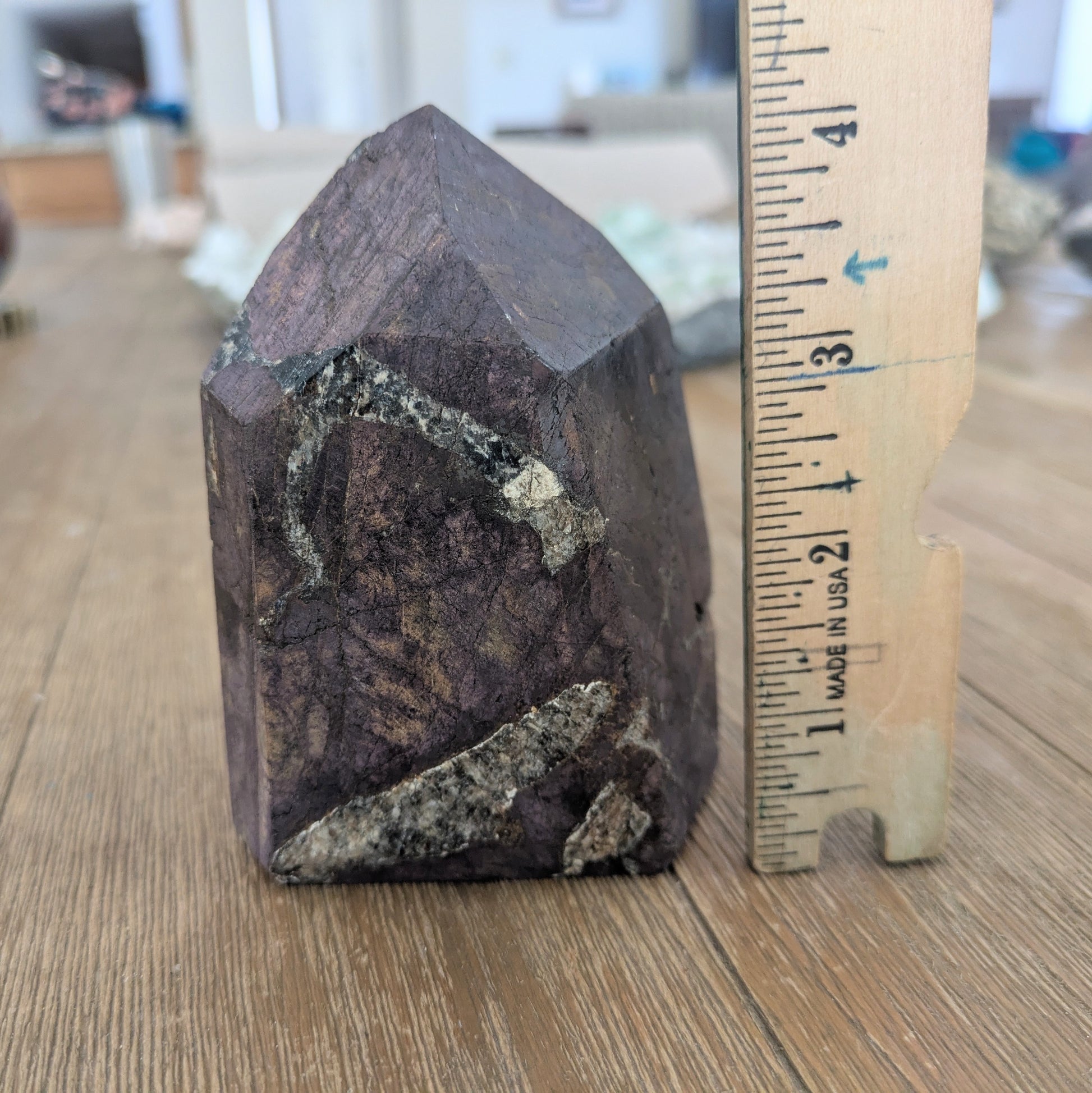 Purpurite is an exciting addition to the website! This asymmetrical tower is a deep purple in coloration, with black/white banding. This is an expansive stone; however, it also feels comfortingly grounding. What an amazing feel to this one! According to the Book of Stones, purpurite teaches us how to "walk on the Earth while maintaining spiritual consciousness."