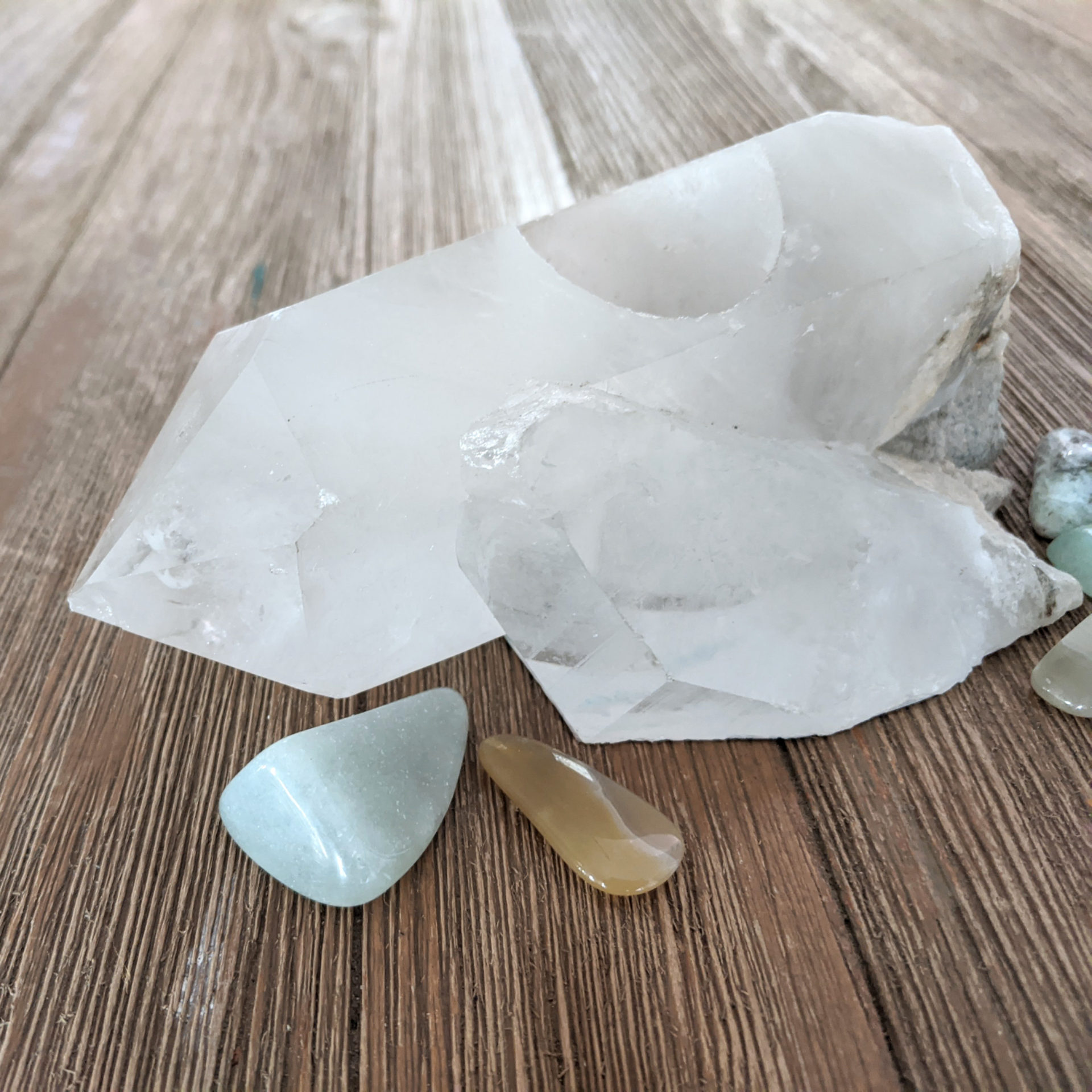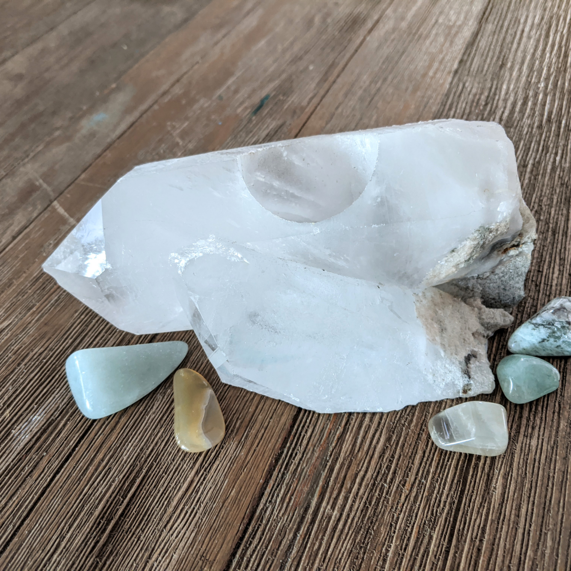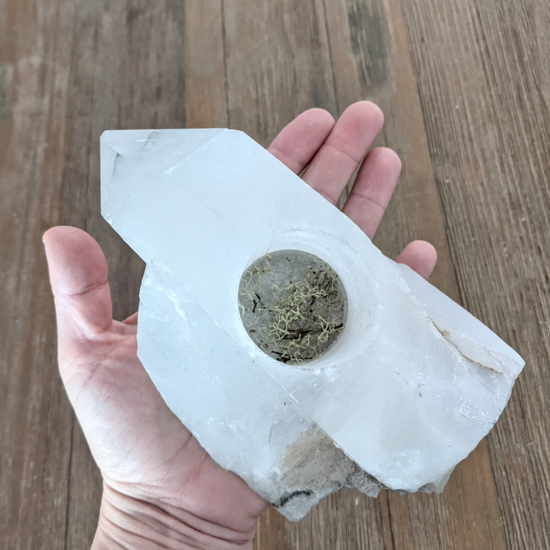 This quartz point has been carved in the middle to become a candle holder - or even a succulent/air plant holder!