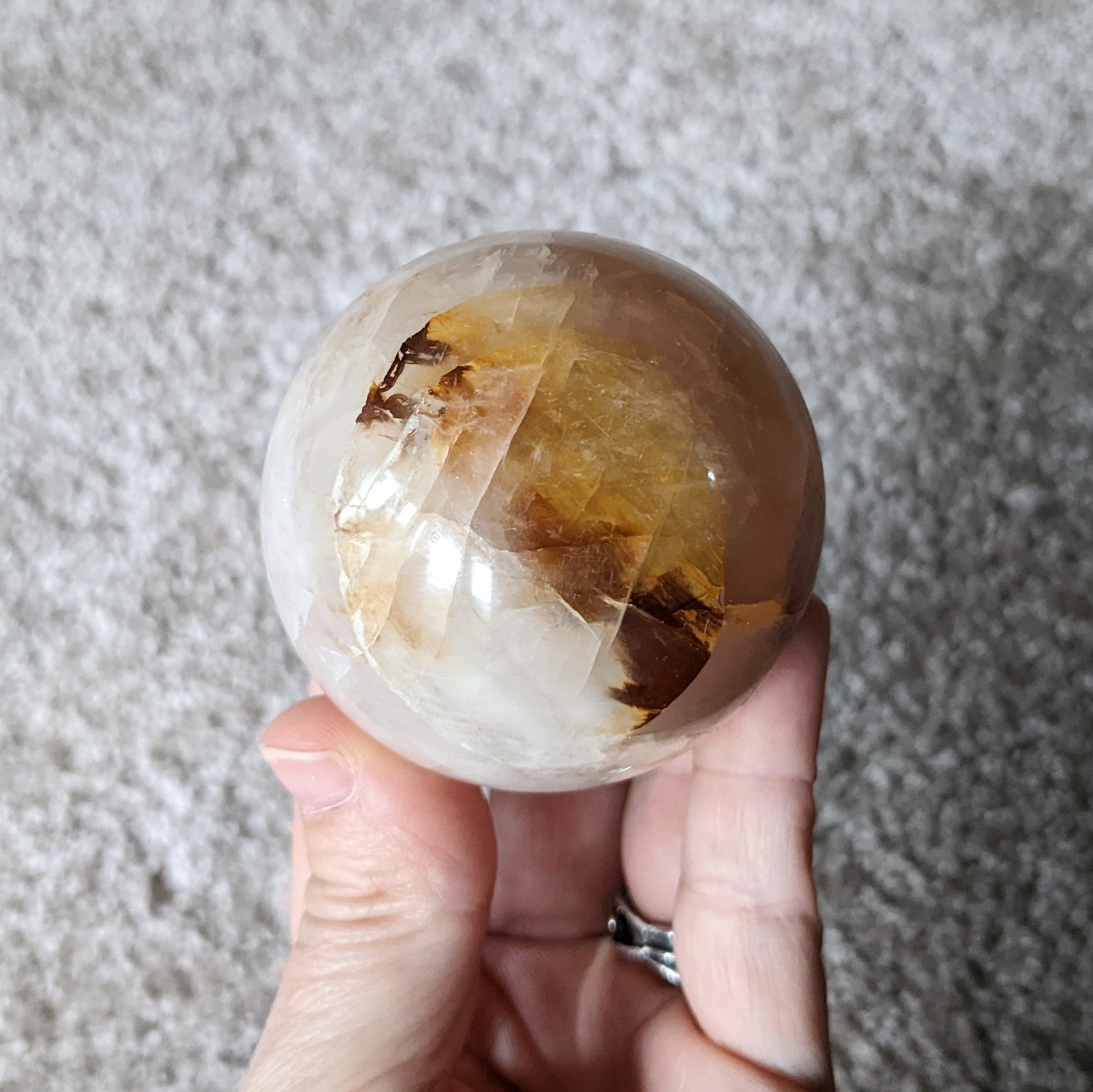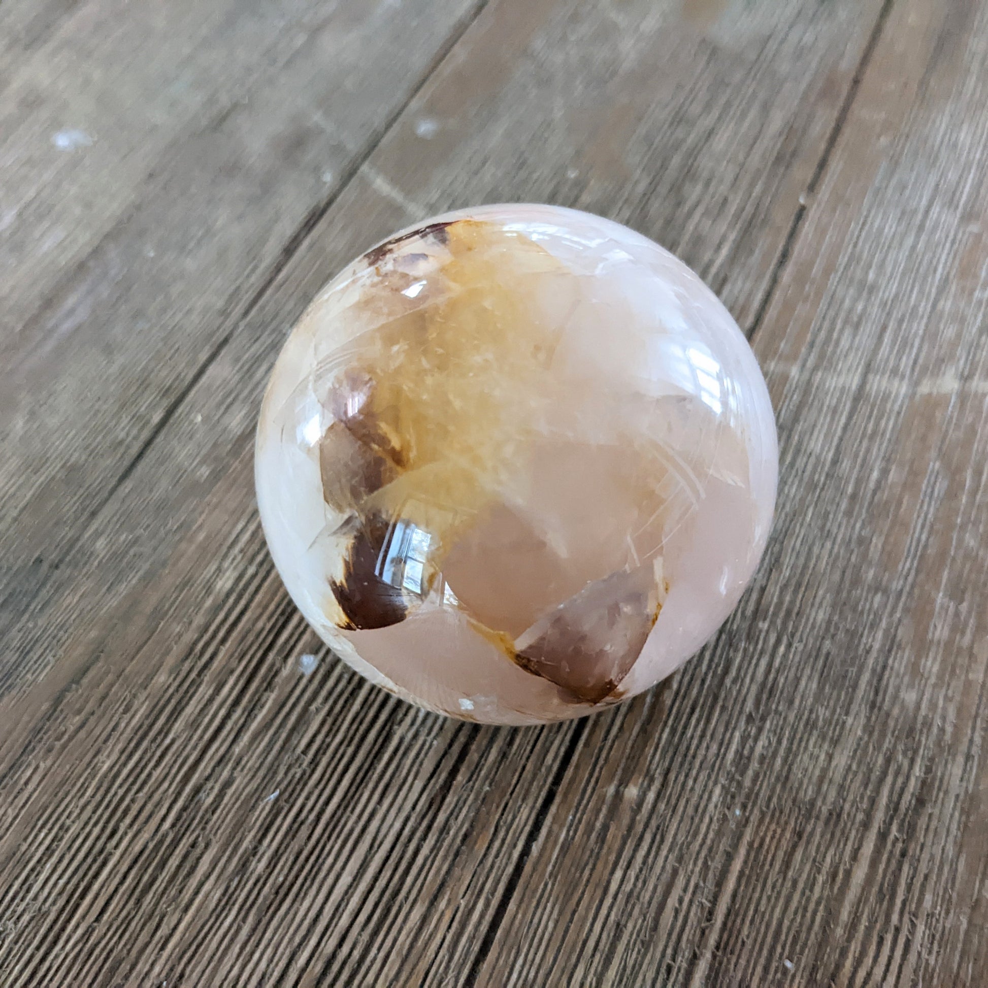 These glossy spheres are a combination of rose quartz and golden healer quartz. You can see the depth of texture and color from the pictures. This combination lays to rest the assumption that gentleness is weakness. There is no denying the power of this sphere!