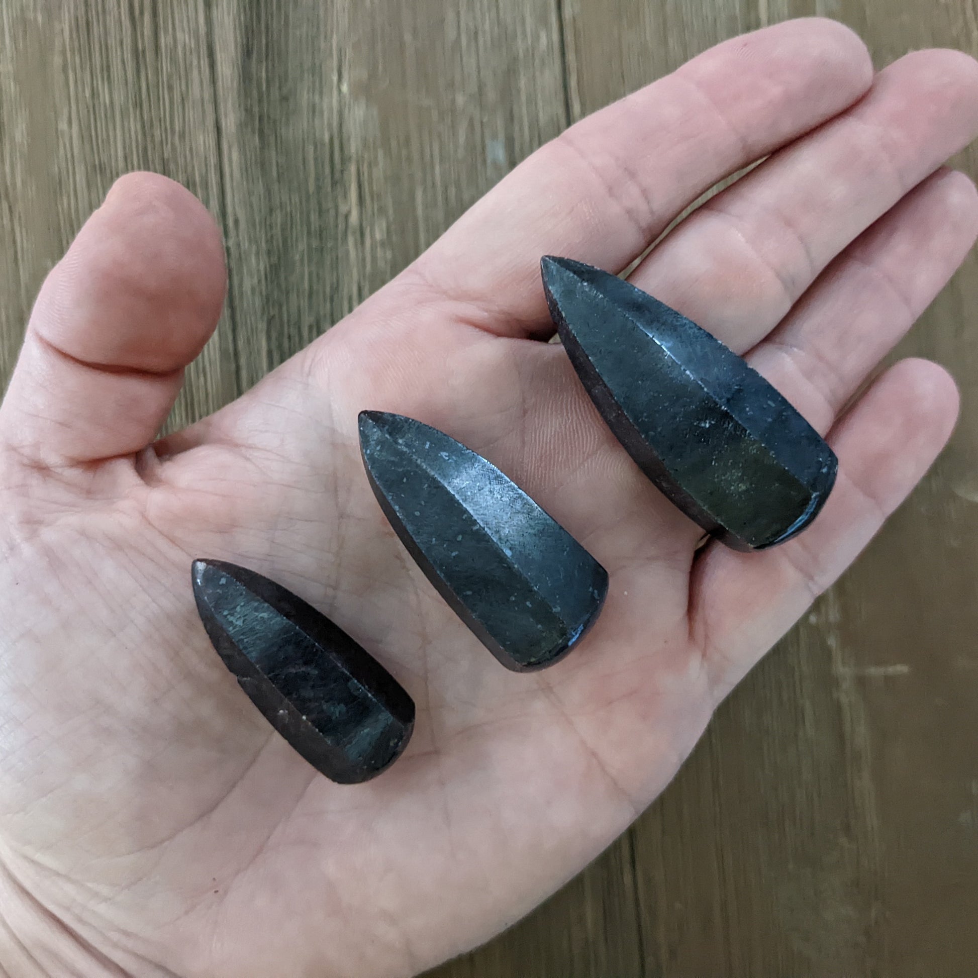 These carved rubies are deep in coloration. When held in the light, the deep red/maroon hue is illuminated. The size of the rubies is perfect for slipping in a pocket or holding in the hand. The carved nature makes them decorative in a dish or on a shelf.