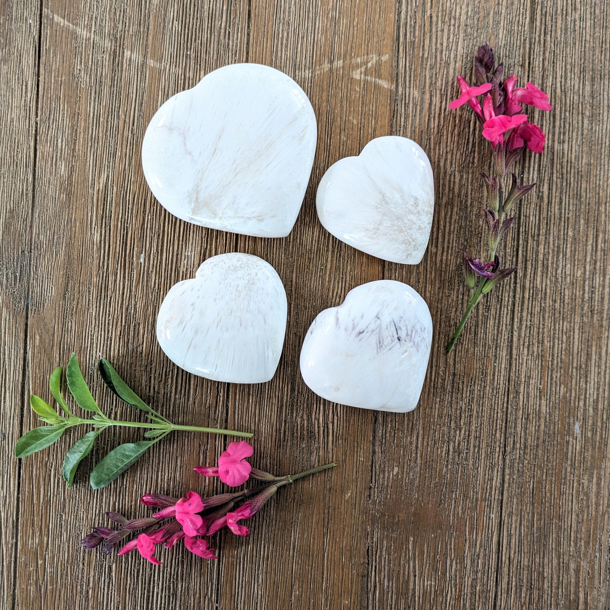 Scolecite is a powerfully soothing stone. These heart stones are smooth but the variation and texture that can be seen within is amazing. Each stone is unique in its markings and you can choose which one you would like. These fit wonderfully in the palm.