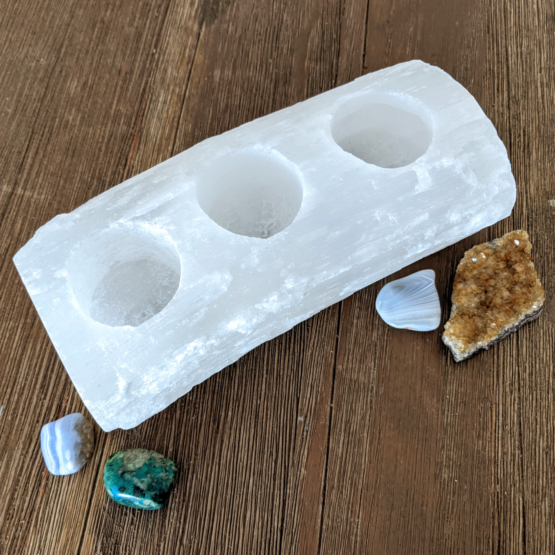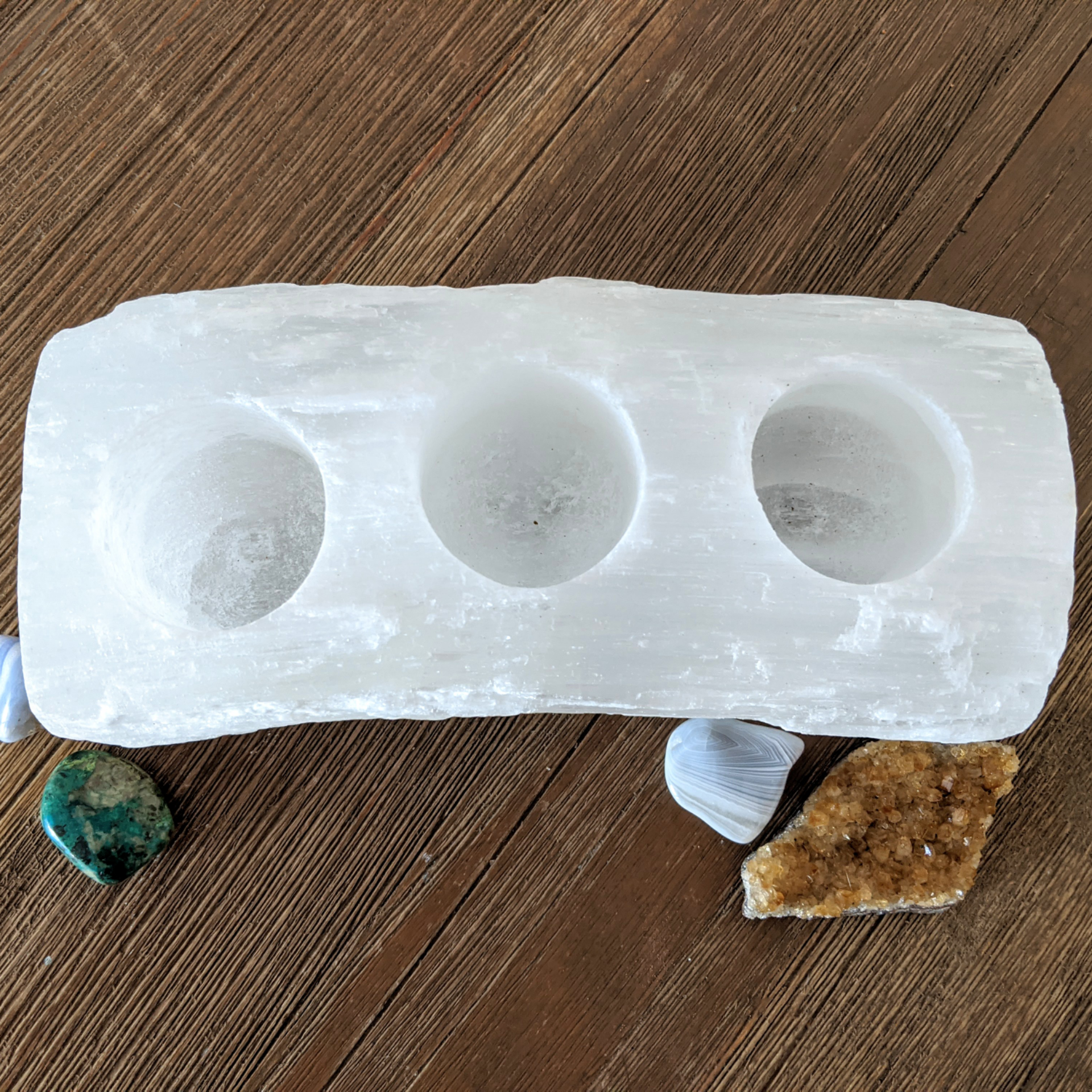 This selenite candle holder is carved from rough selenite. It holds three votive candles.