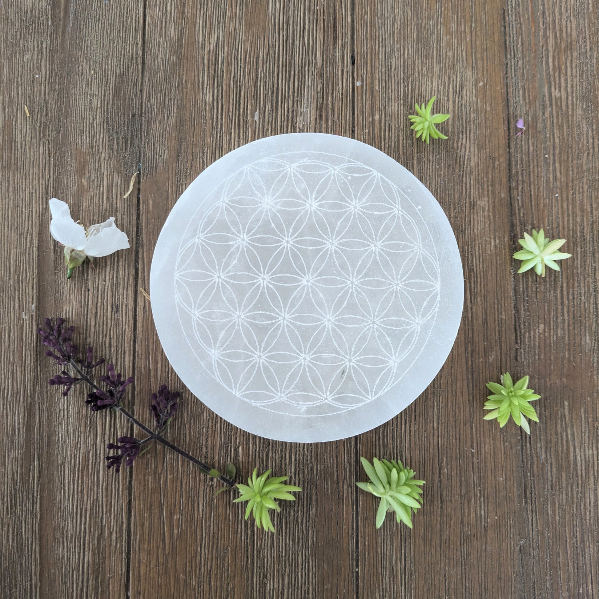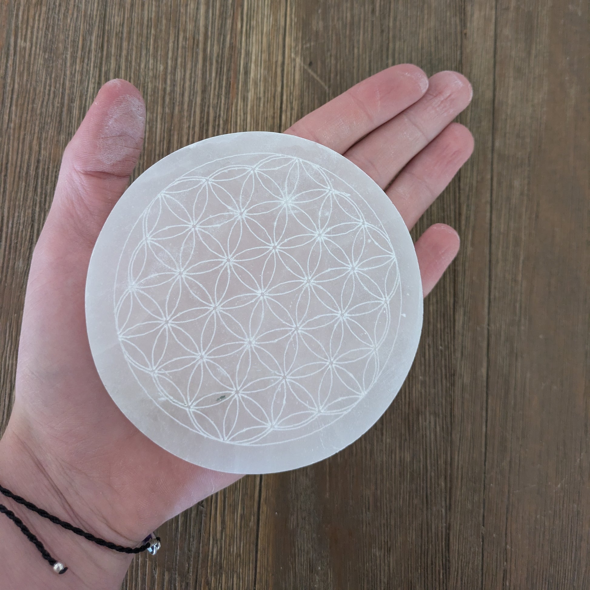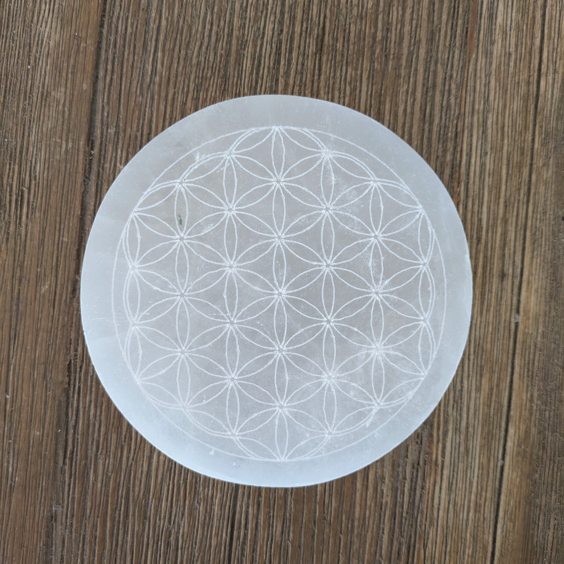 This selenite charging plate is engraved with the flower of life. Use it as decoration or to charge crystals and jewelry!