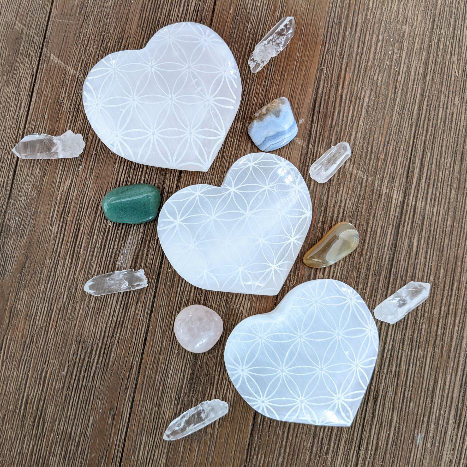 These selenite hearts are the perfect size for uplifting the energy in a room or for clearing and charging jewelry and stones.