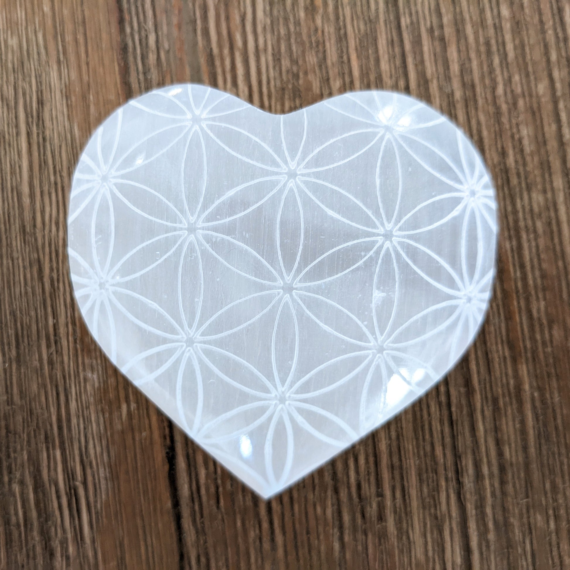 The Flower of Life symbol is carved into this heart. This symbol represents the cycle of creation and connectedness.