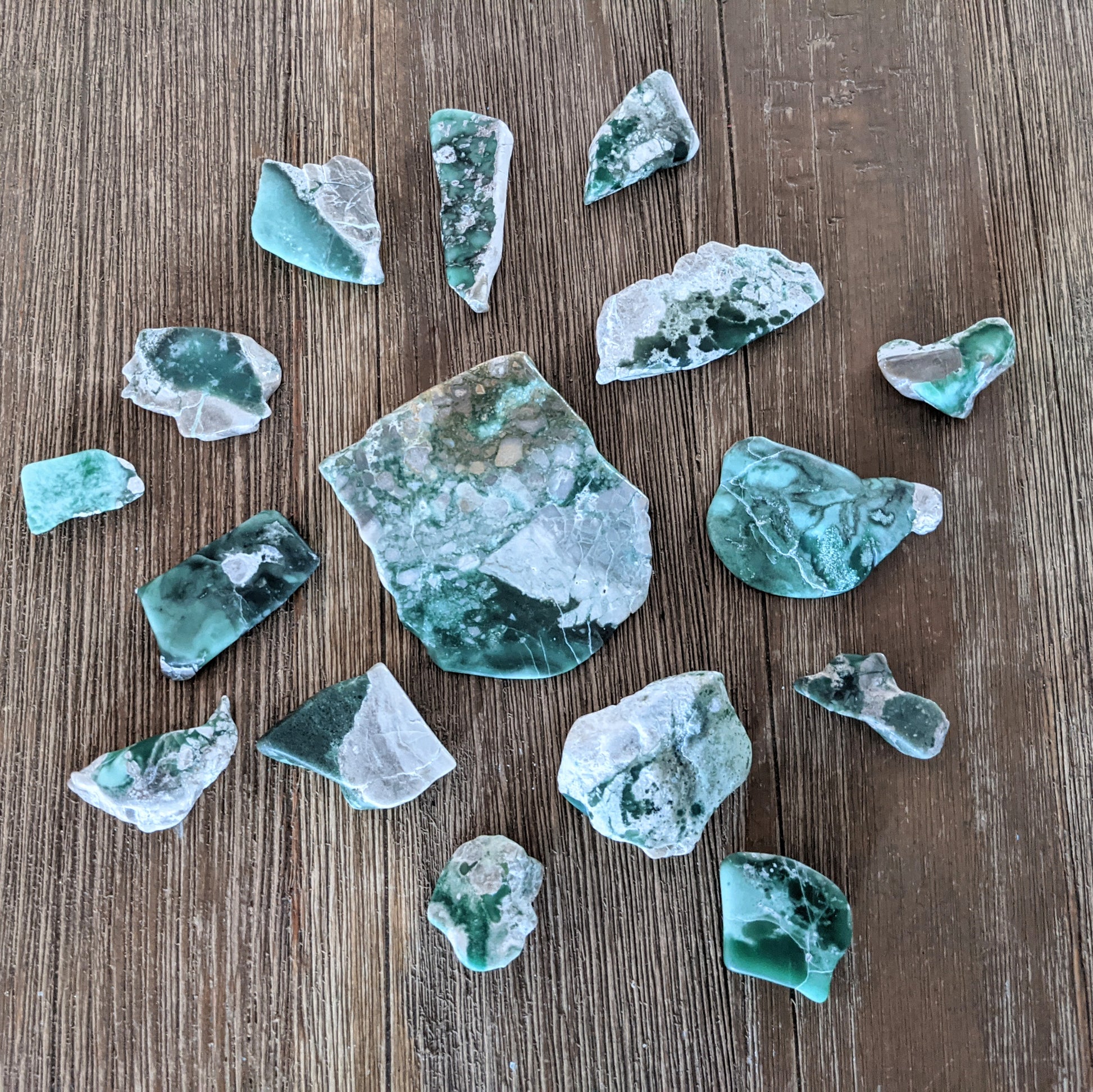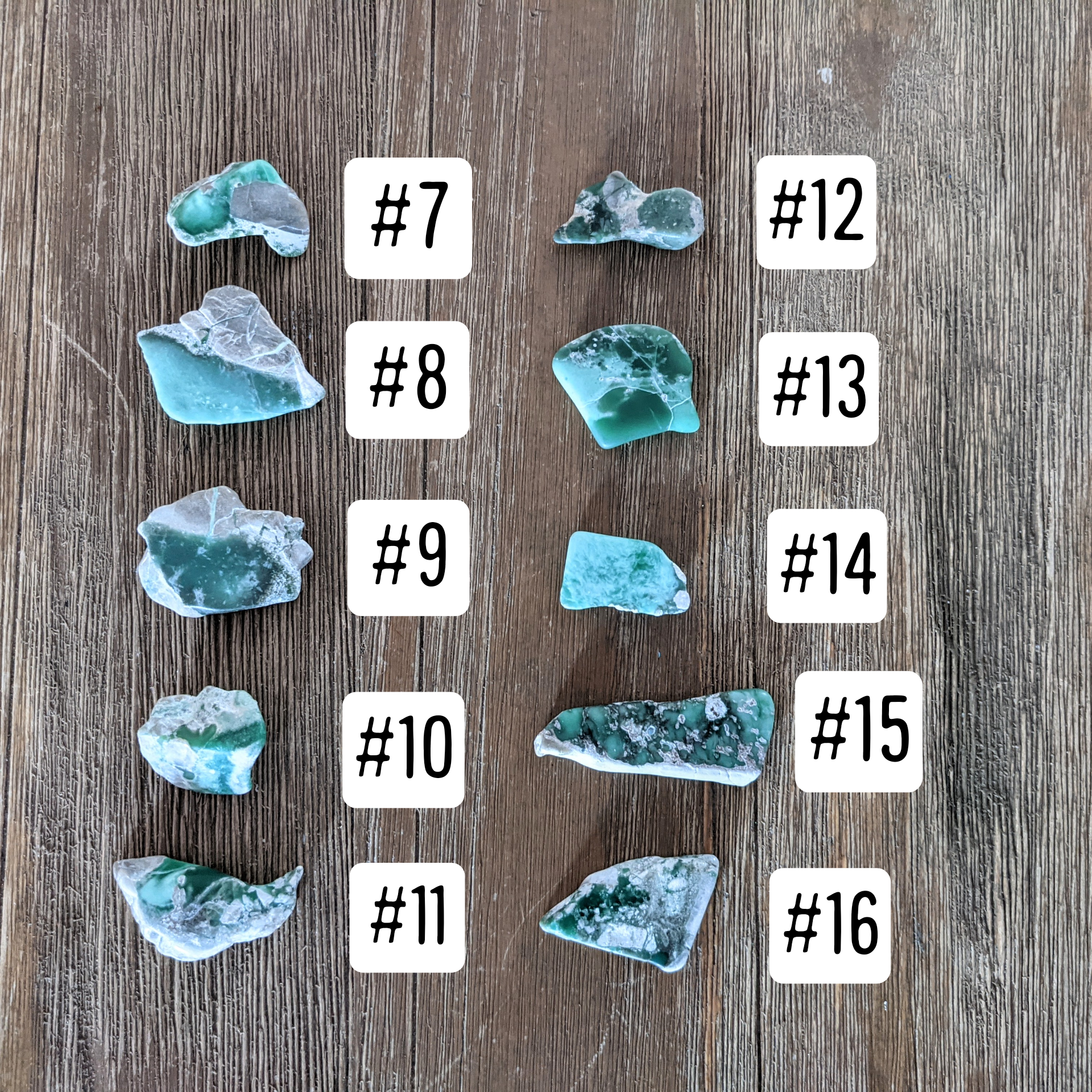 We purchased these pieces as a bulk package and spent some time tumbling them so that they would maintain their rough outline (shape) but they would feel and look smooth and polished! The result is wonderful. Variscite is a stone of the heart and immediately puts a smile on your face. :)