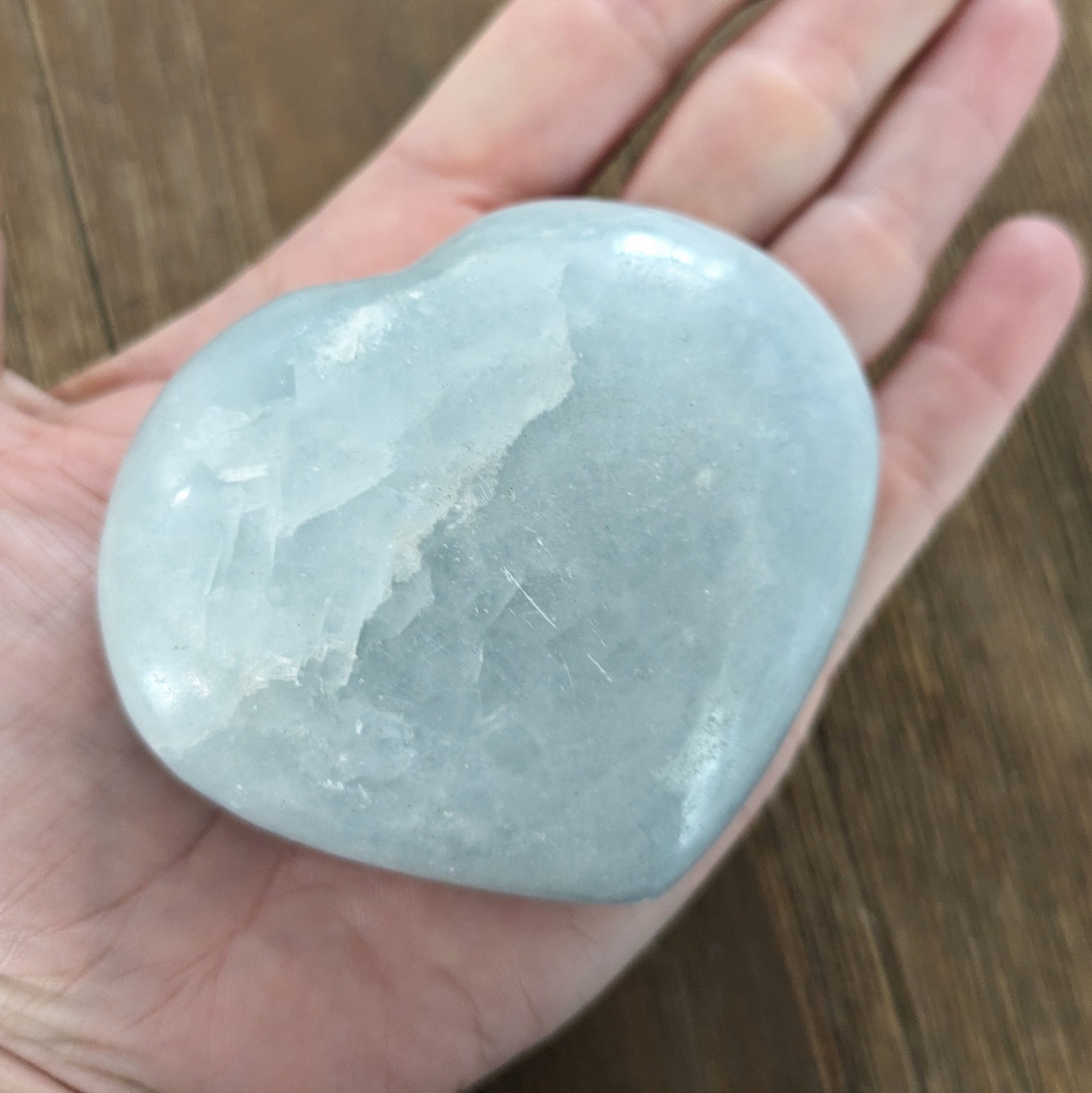 Blue calcite has been shaped into a heart and polished to a smooth finish.