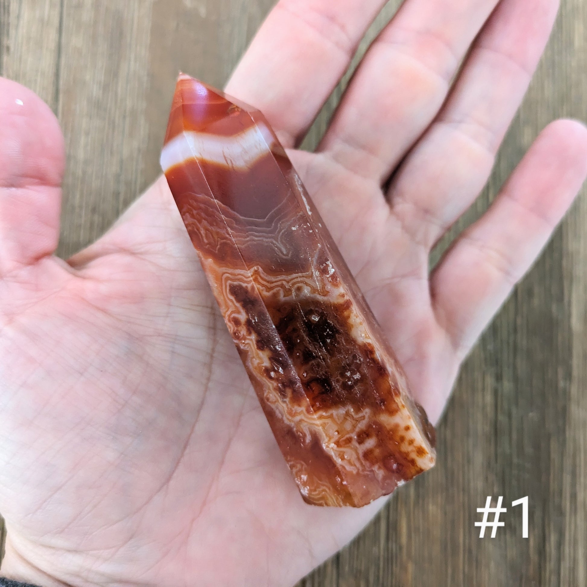 These carnelian towers are wonderful in their variation and texture. They have been polished to a smooth finish.