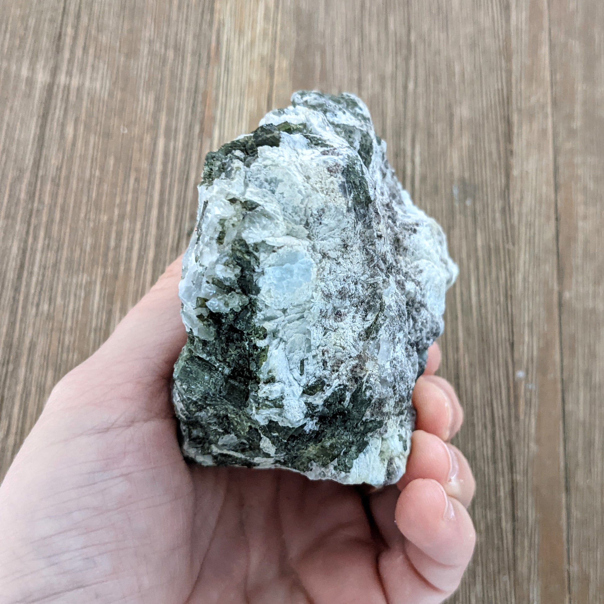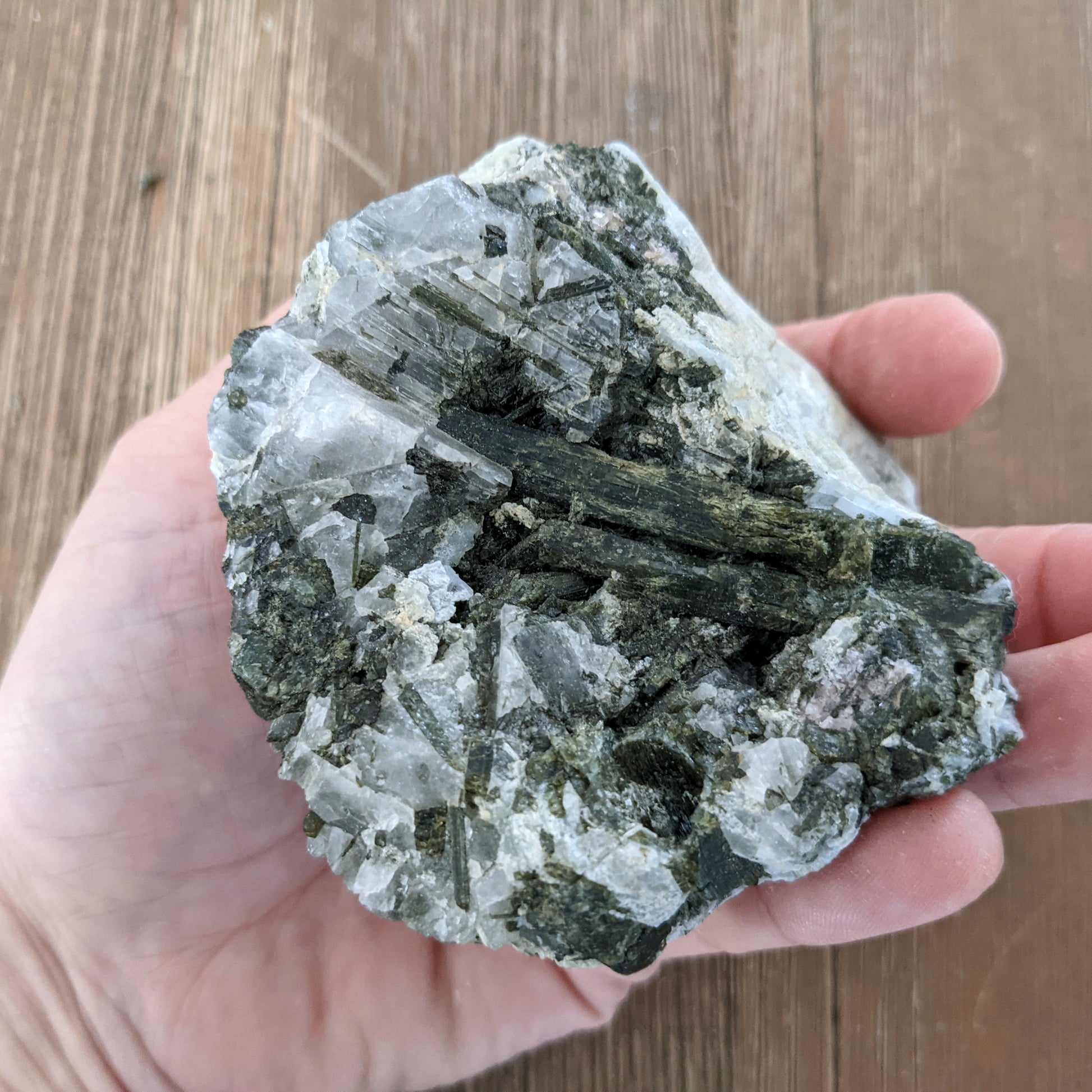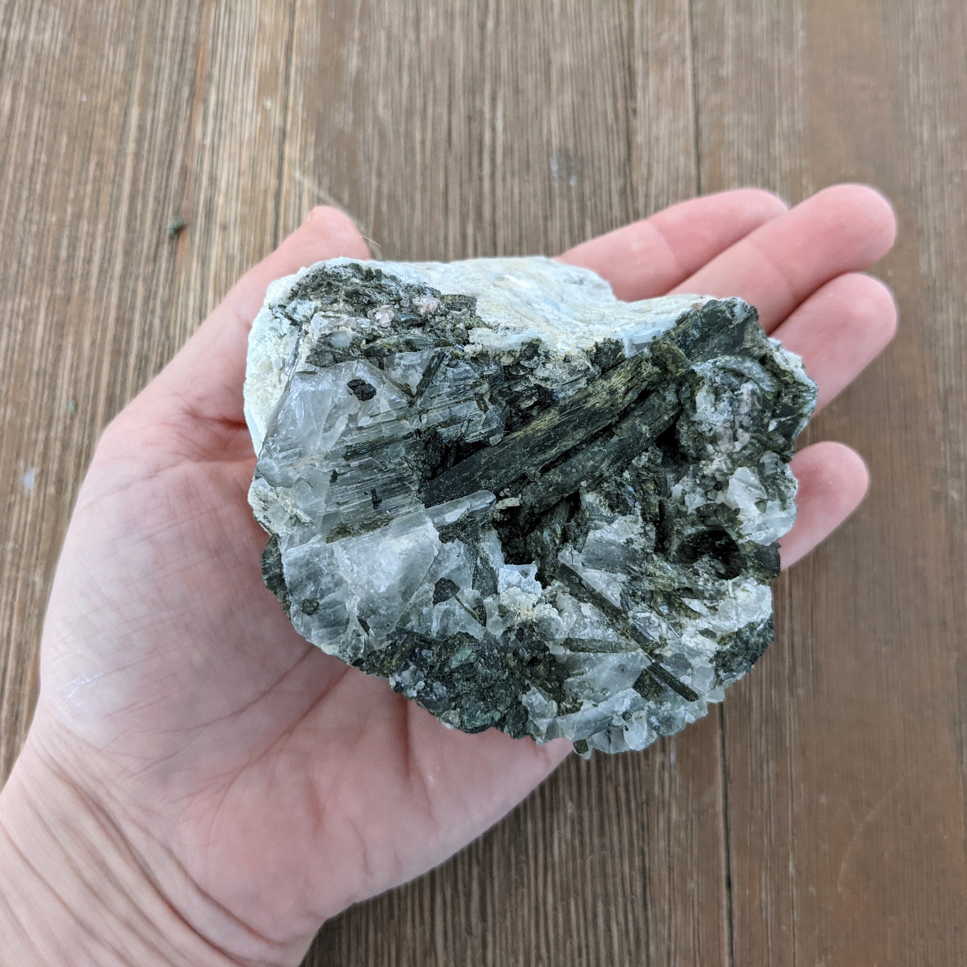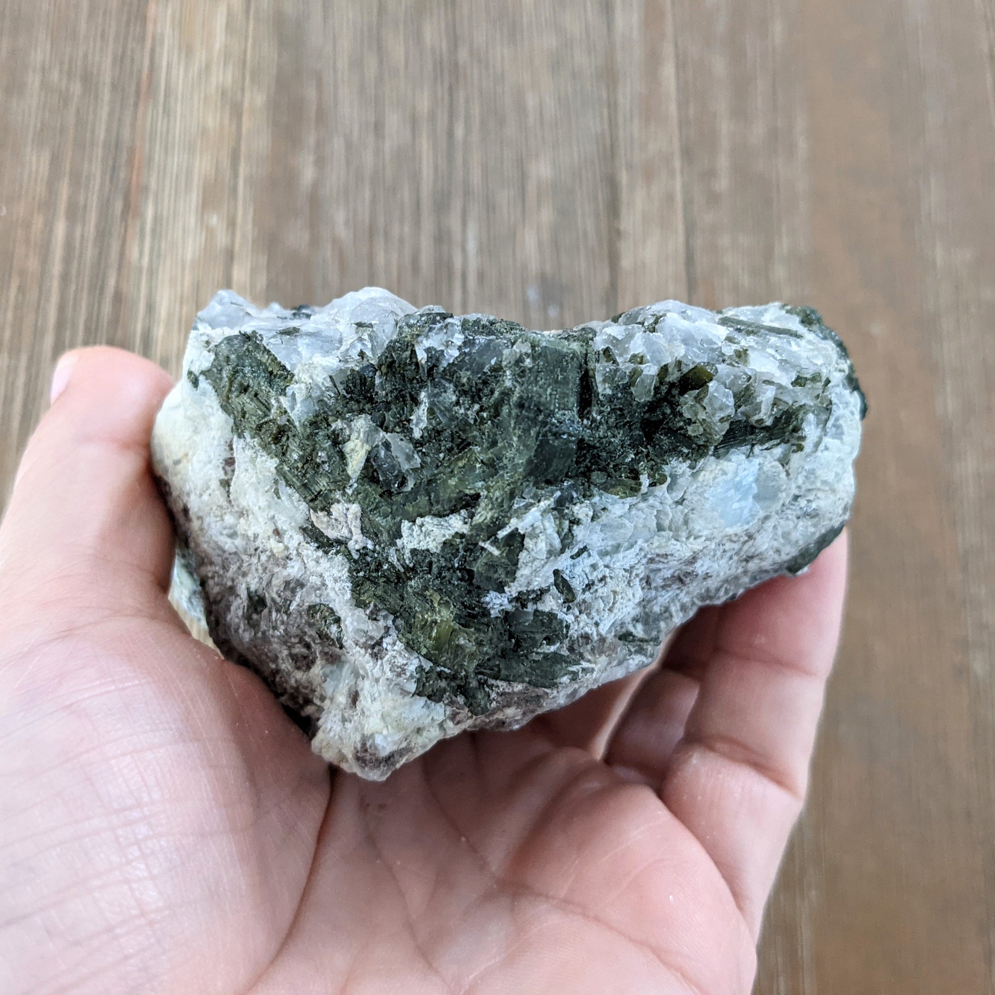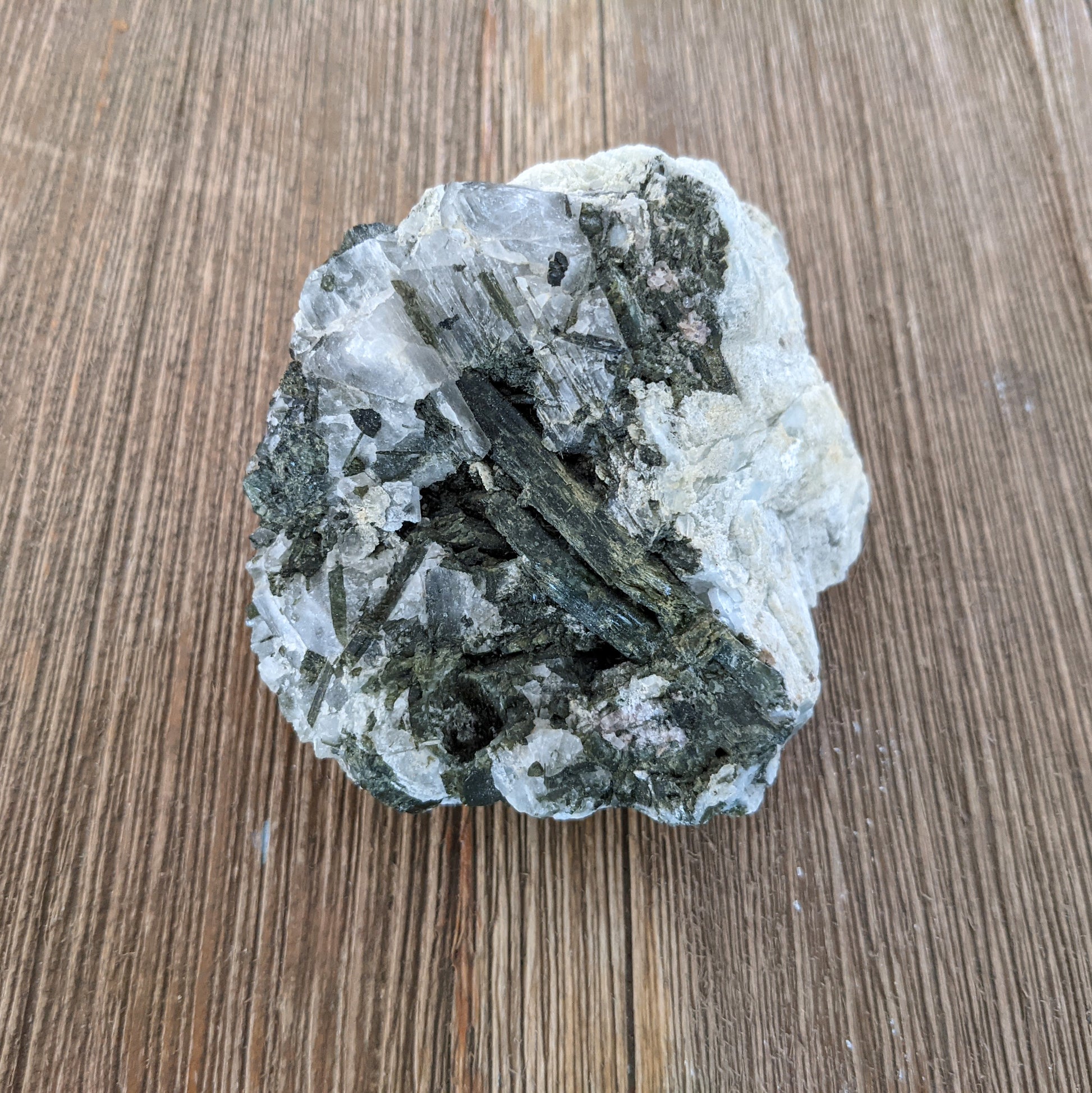 This is a piece of quartz that has a large amount of green tourmaline embedded within!