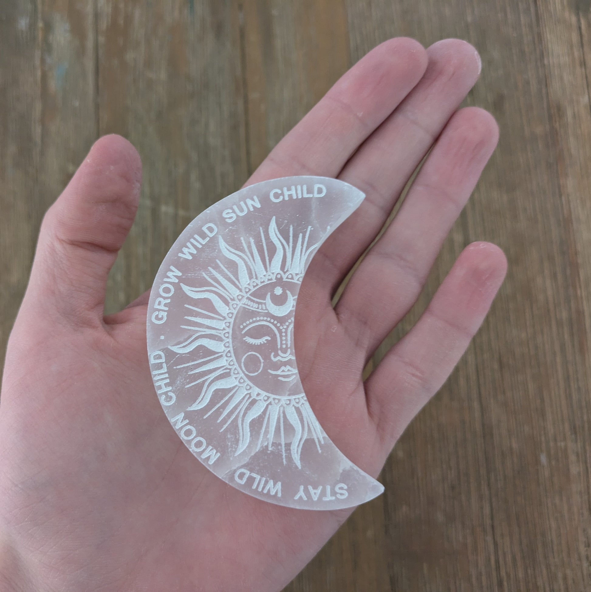 These selenite moons are beautifully etched with a sun design and the inscription: Stay Wild Moon Child. Amazing energy!