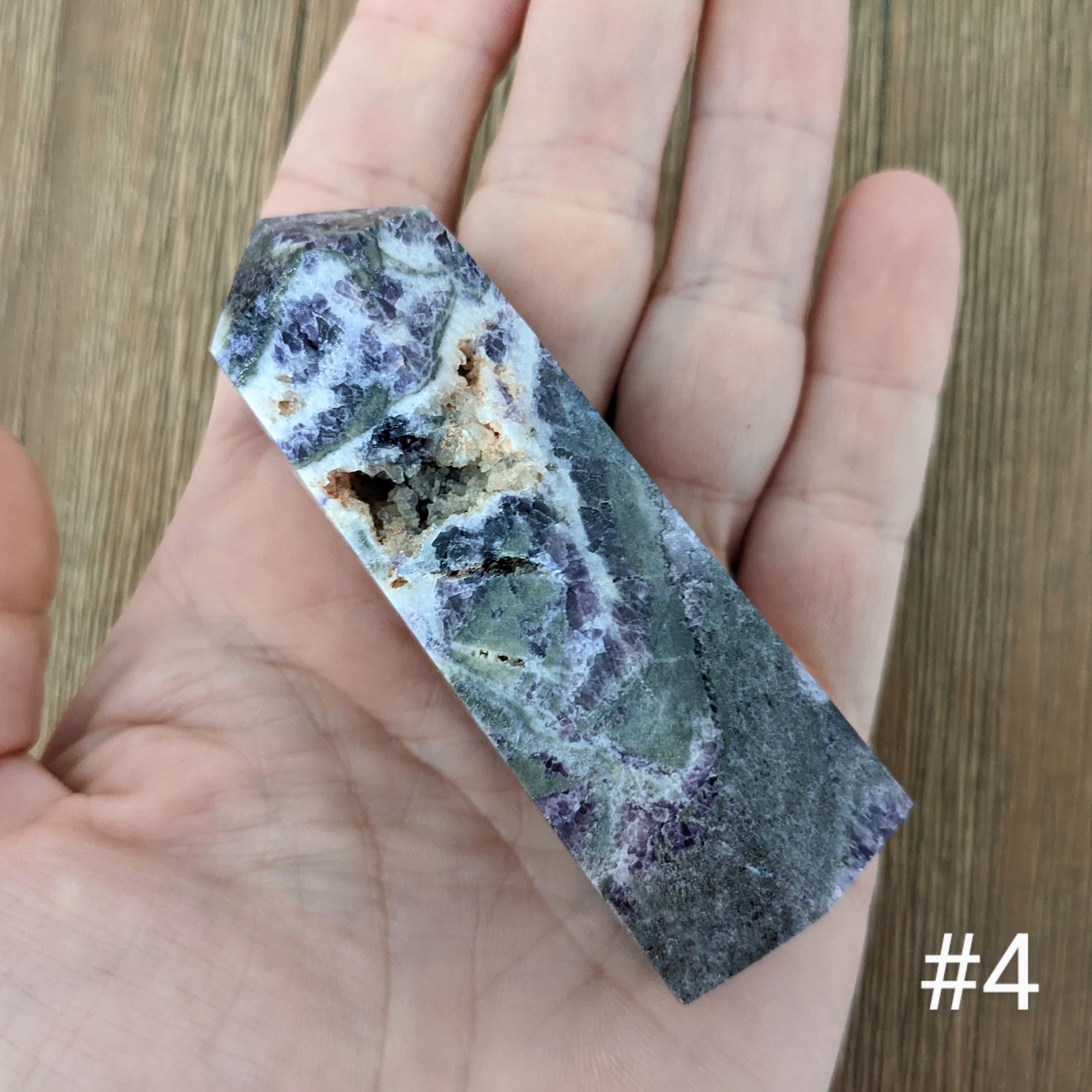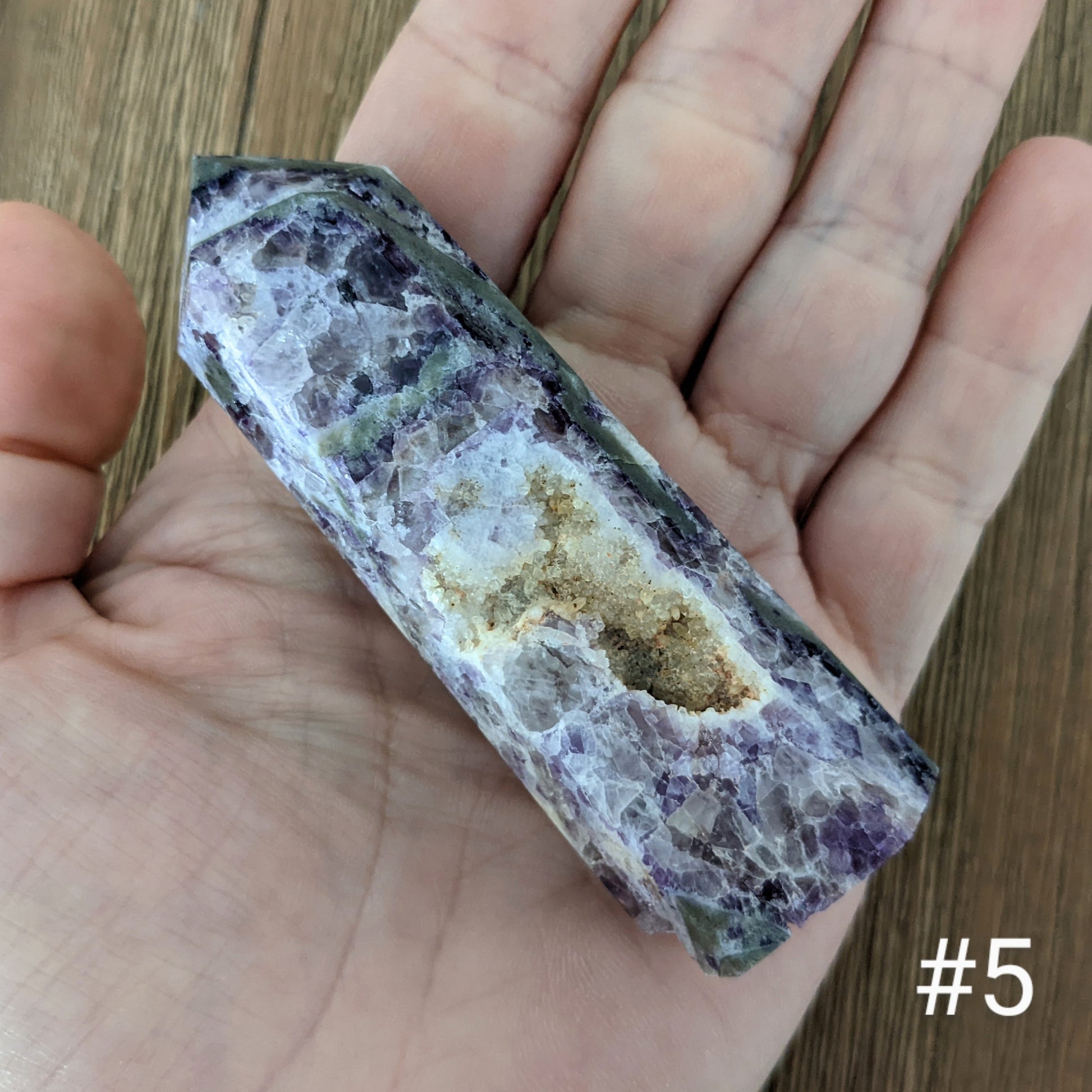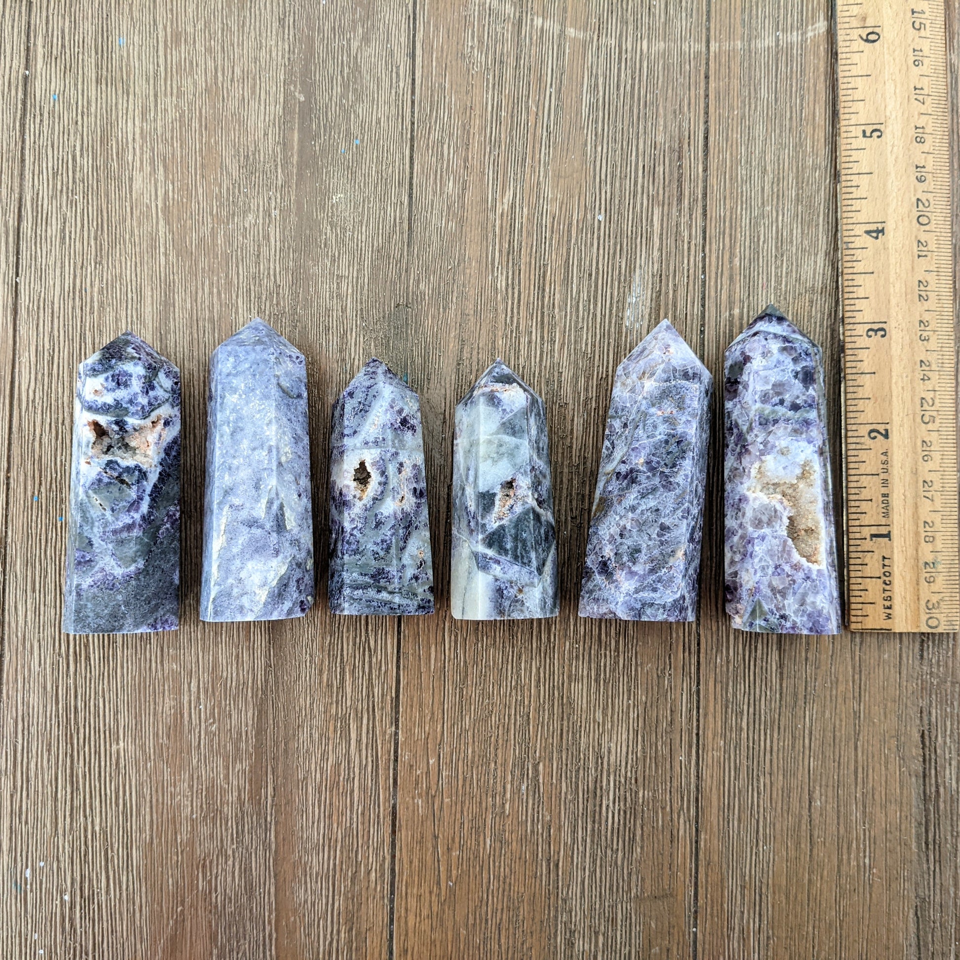 These purple sphalerite towers have distinctive coloration and texture. Several have geodes formed in the sides.